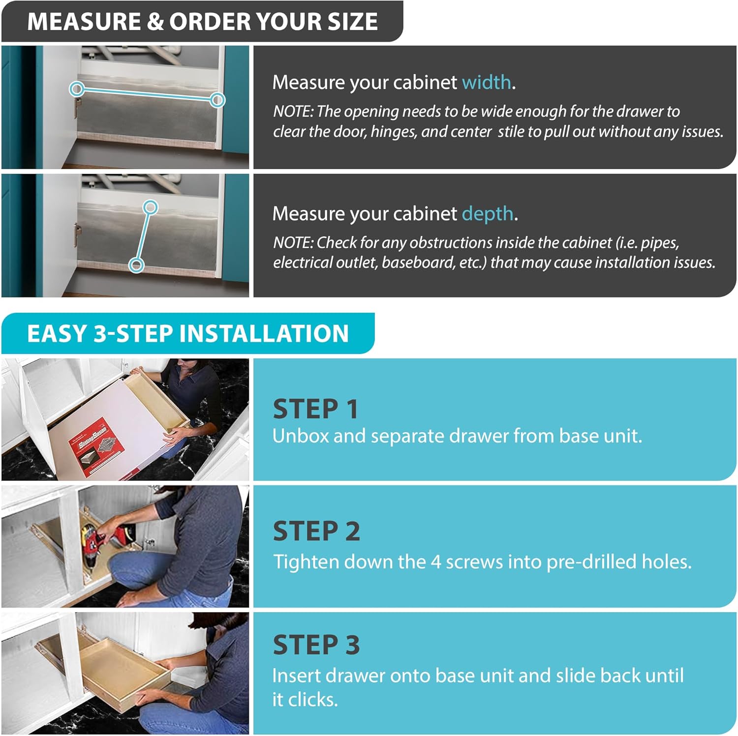 - EASY INSTALLATION: Separate the base and drawer, align the base with your cabinet, install and tighten the 4 included screws, insert the drawer, and slide back until it clicks in place; for best results, pre drill the holes before installing screws