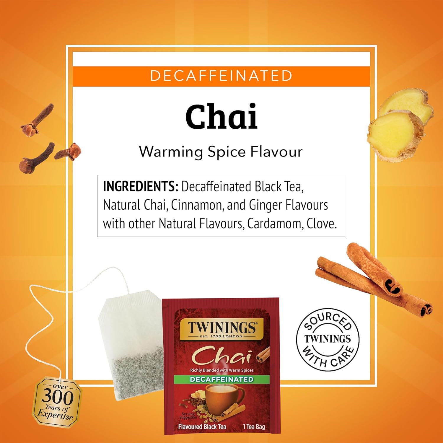 - CHAI BLACK TEA: Blended with the savoury spice of cinnamon, cardamom, clove and ginger for Chai with a bold, spicy taste and rich, vibrant aroma; Decaffeinated, 20 Count, Pack of 6