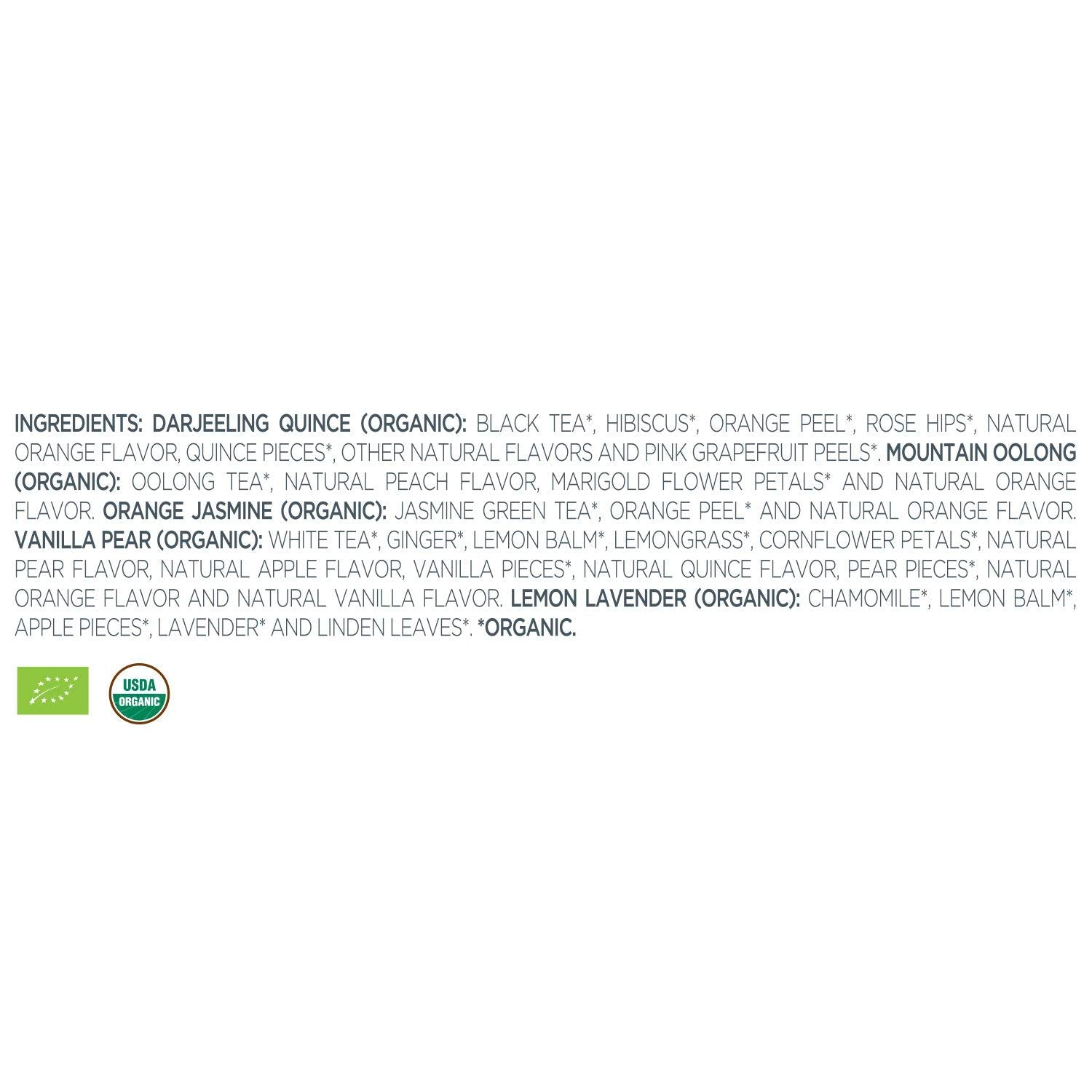 - LOTUS COLLECTION, a curated assortment of five relaxing hot teas for mind, body & spirit - a unique and unprecedented gourmet collection of highest-grade, small-lot, certified organic teas: Vanilla Pear, Orange Jasmine, Mountain Oolong, Darjeeling Quince, Lemon Lavender. Perfect tea gift for Mother's Day.