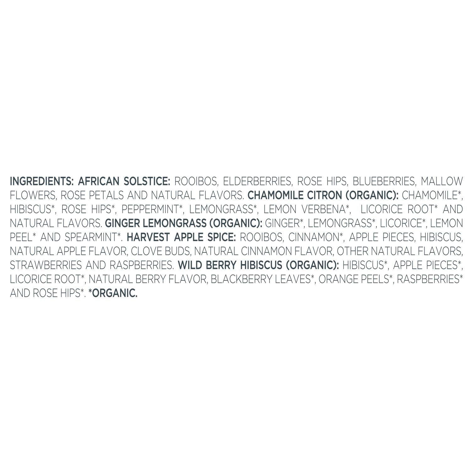 - HERBAL TEA ASSORTMENT with five varieties of our most popular, naturally caffeine-free, herbal tea blends - African Solstice, Chamomile Citron, Ginger Lemongrass, Harvest Apple Spice and Wild Berry Hibiscus.