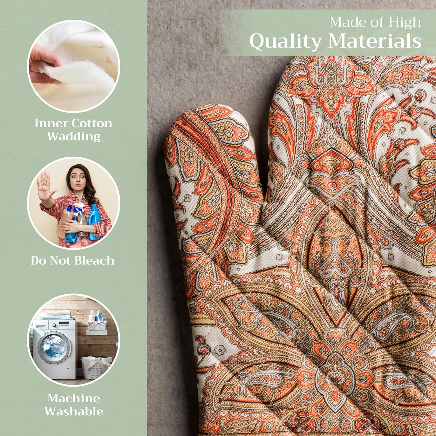 - 100% Quilted cotton: Crafted from thick, durable quilted cotton, this heat resistant oven mitt provides a soft feel, safe handling, and lasting performance. A must-have kitchen accessory for everyday cooking, roasting, or baking tasks