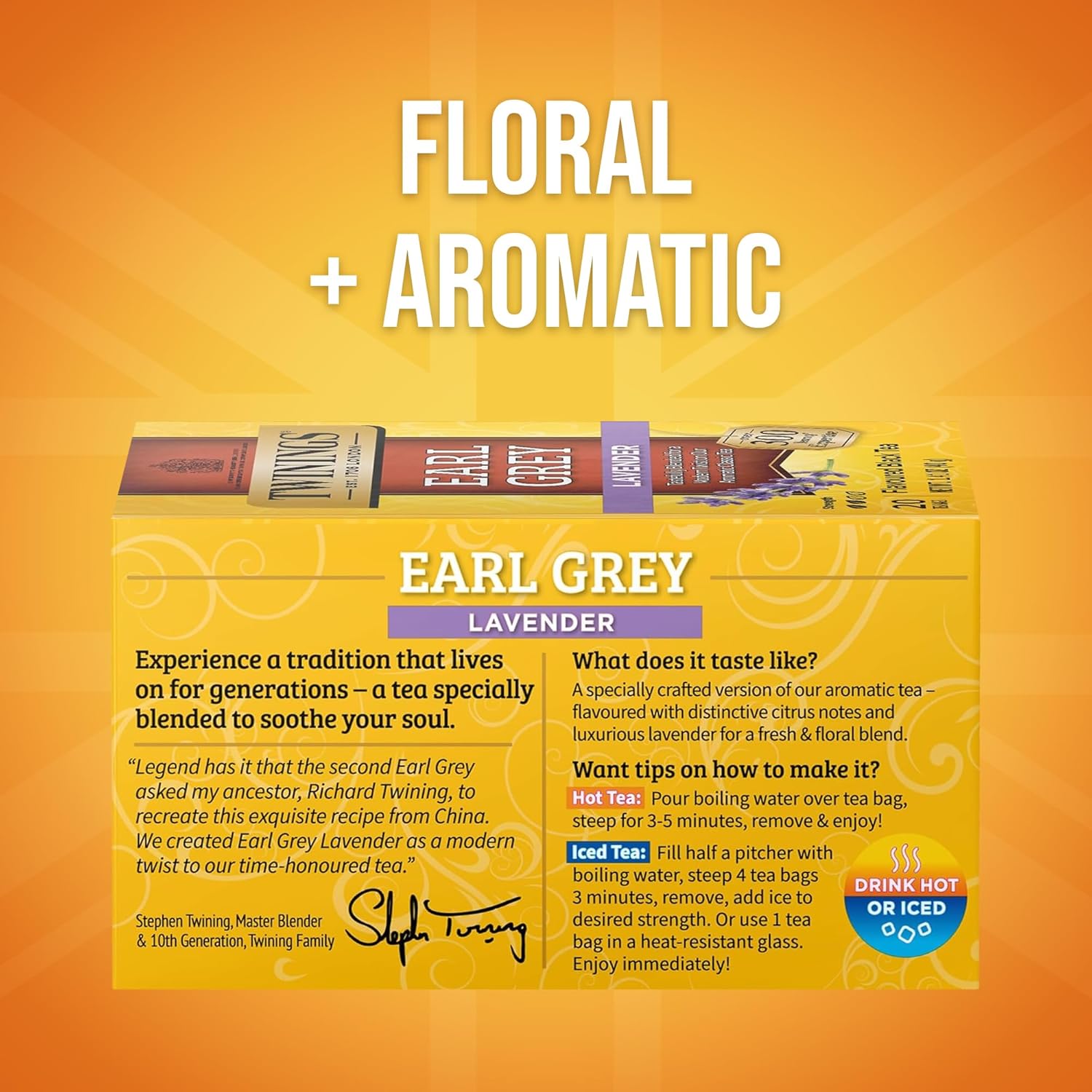 Twinings Earl Grey Lavender Black Tea Individually Wrapped Bags, 20 Count (Pack of 6), Citrus, Bergamot & Floral, Caffeinated, Enjoy Hot or Iced, 120 Teabags