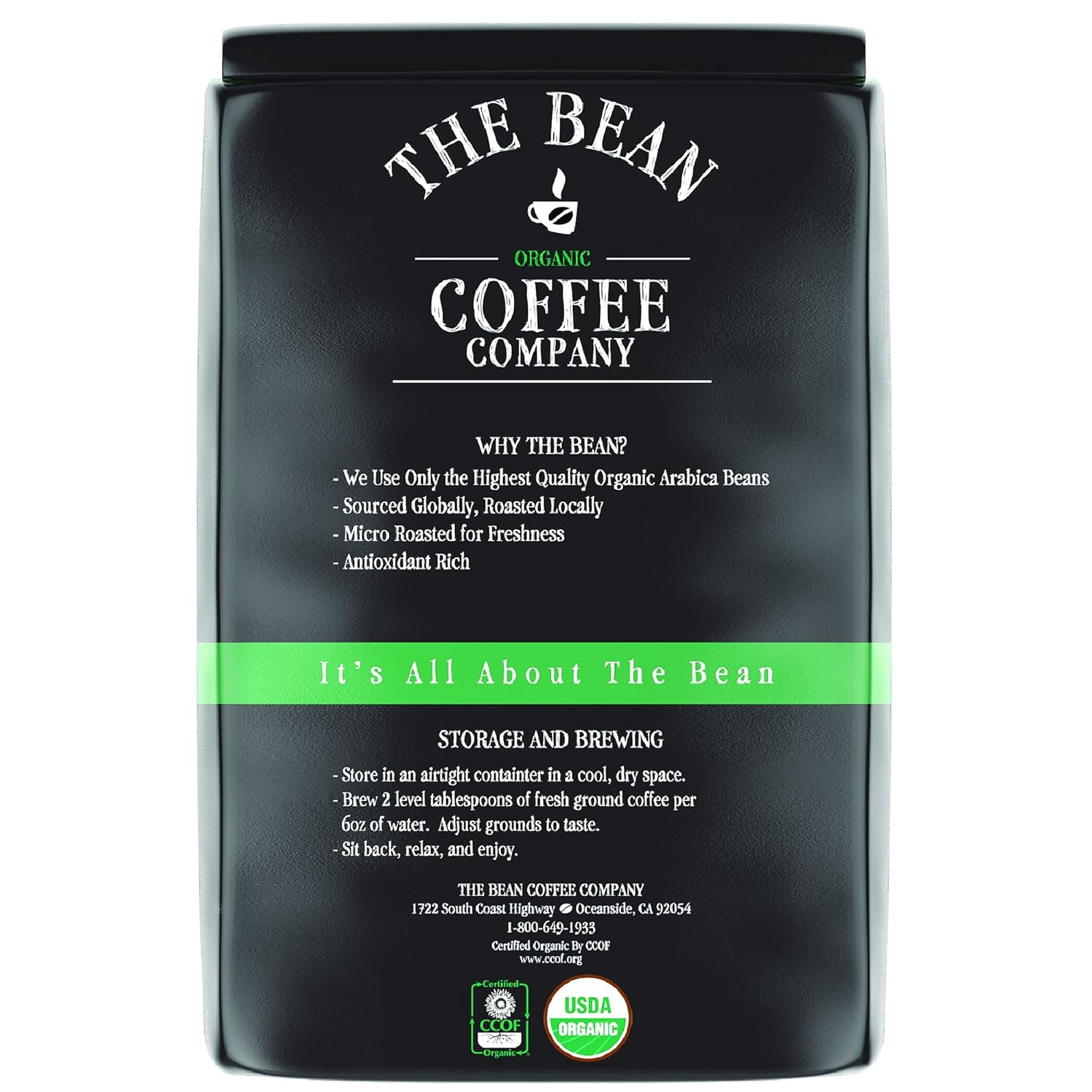 - CERTIFIED ORGANIC: The Bean Organic Coffee Company uses 100 percent organic coffee beans, certified by the USDA and CCOF (California Certified Organic Farmers). The Bean Coffee Company uses certified organic flavoring as well