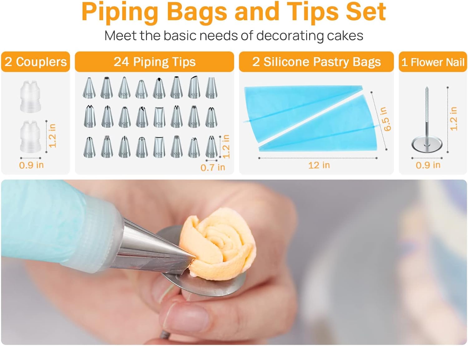 - Complete Cake Baking Tools: Get ready to bake with ease using our all-in-one cake decorating supplies kit! It includes everything you need to get started: non-slip 11-inch aluminium alloy cake turntable for decorating, 24 numbered piping tips, 2 reusable pastry bags, angled offset and straight icing spatulas, 3 stainless steel cake scrapers, 1 flower nail, and 2 standard couplers.