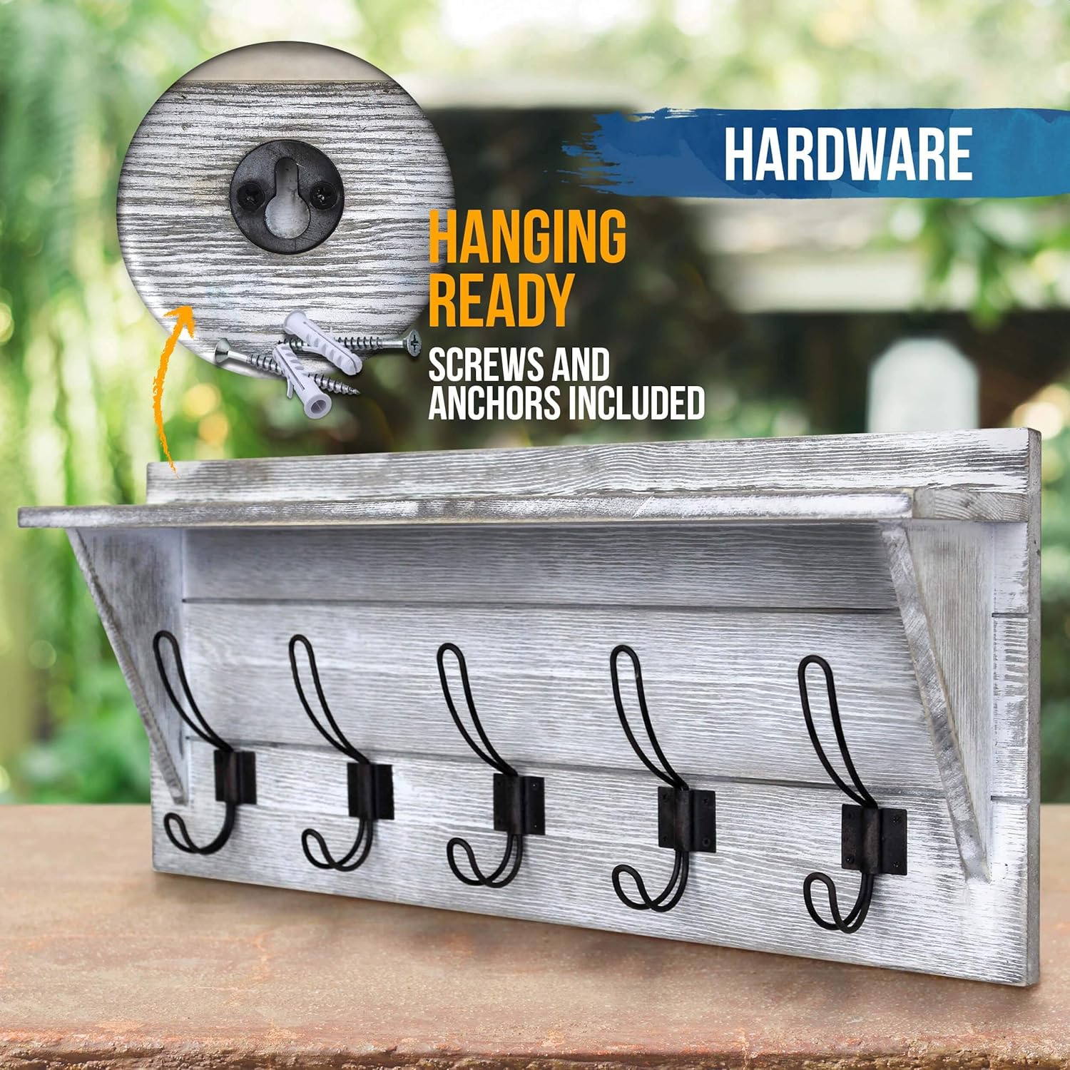 HBCY Creations Rustic Wall Mounted Coat Rack with Shelf - Solid Wood 24" Entryway Shelf with 5 Coat Hangers. Perfect Touch for Your Entryway, Mudroom, Kitchen, Bathroom and More, Whitewash
