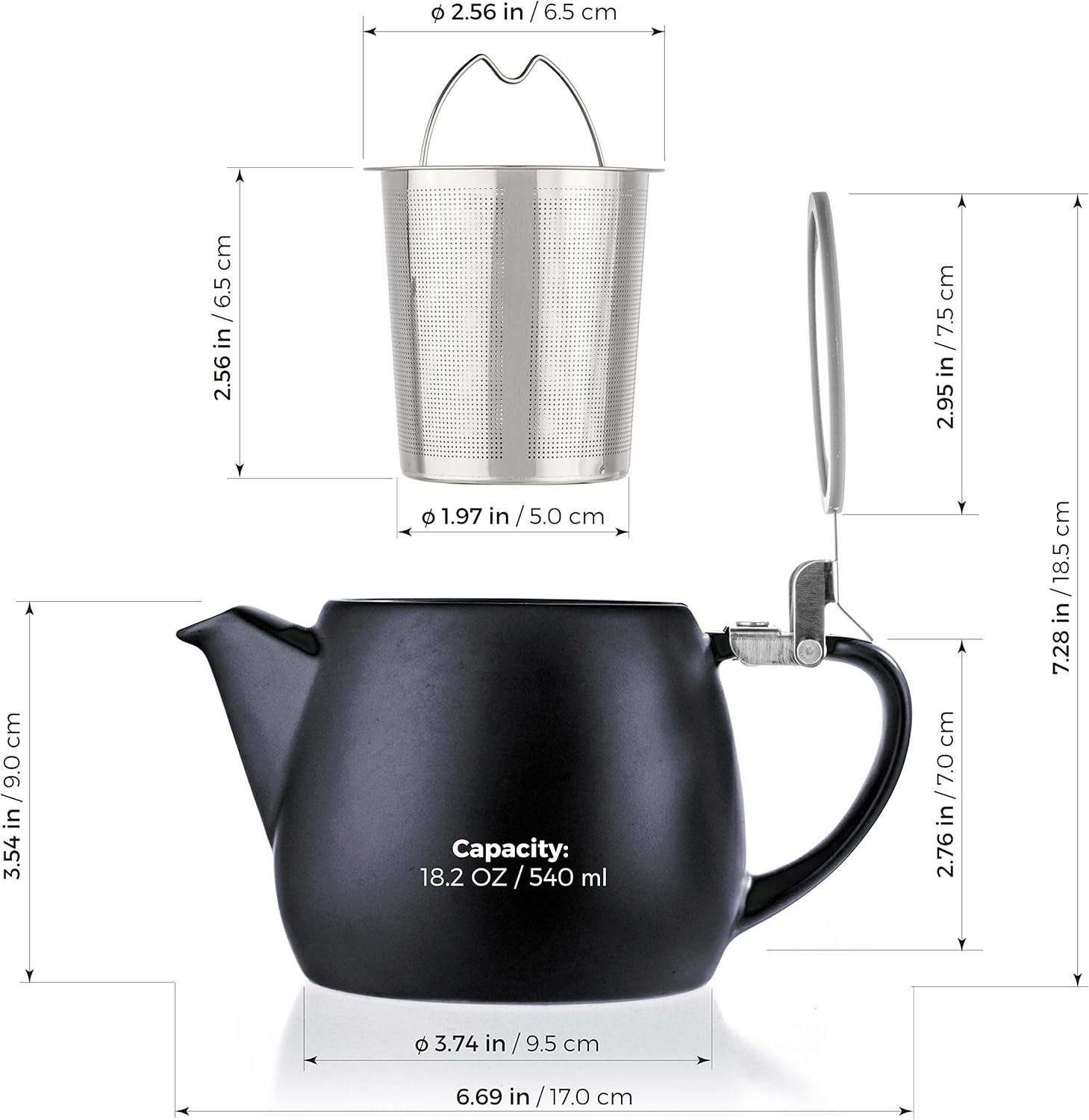 Tealyra - Pluto Porcelain Small Teapot Black - 18.2-ounce (1-2 cups) - Matte Finish - Stainless Steel Lid and Extra-Fine Infuser To Brew Loose Leaf Tea - 540ml