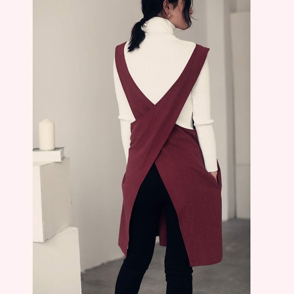 Cotton Linen Japanese Apron Halter Cross Back Bandage X Shape Aprons Two Pockets