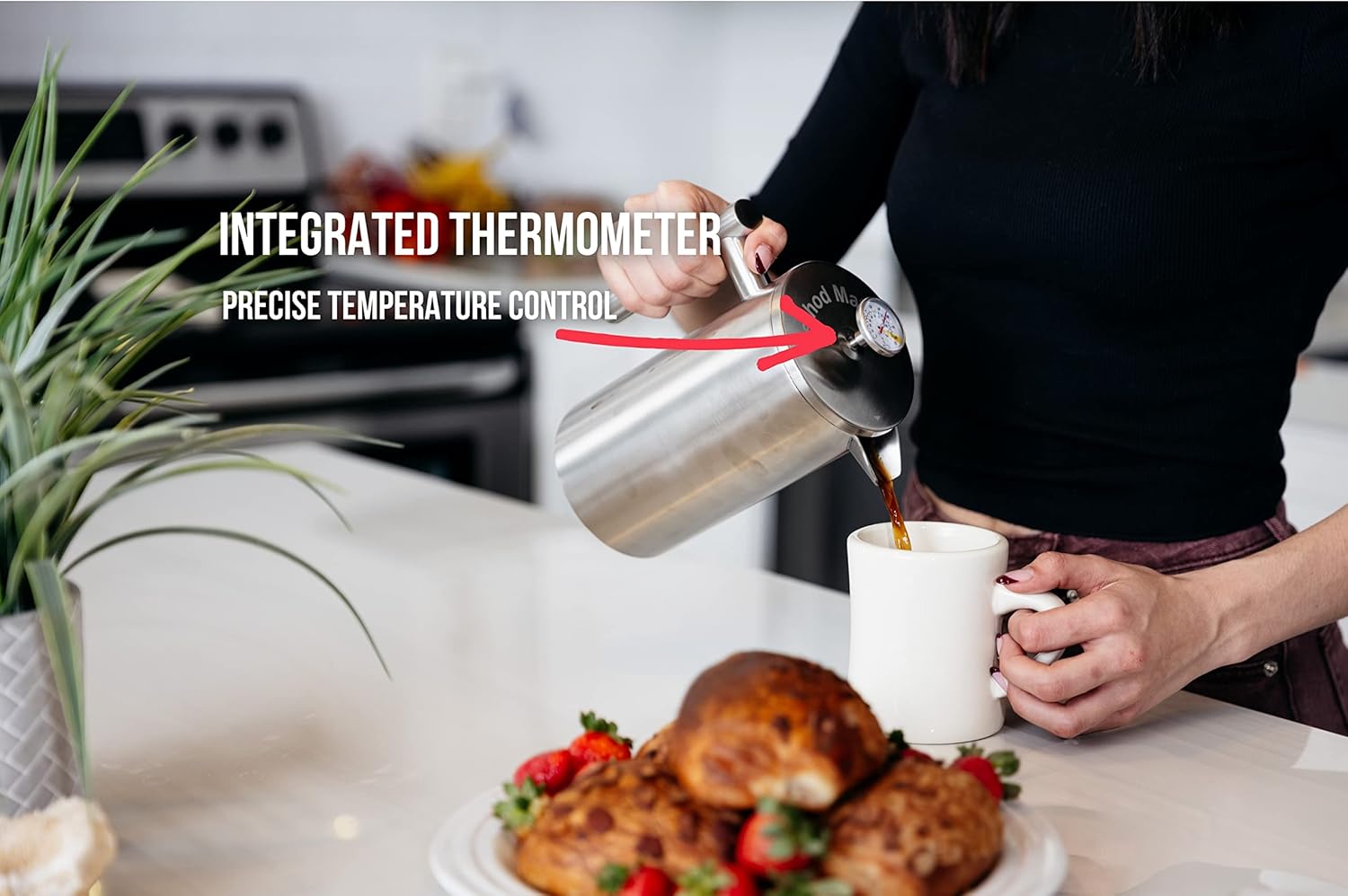 - BUILT-IN THERMOMETER: It provides a perfect temperature. Water that is too hot will burn your coffee. If it is too cold, you won’t extract the full consistency of the beans. Our french press comes with an auto temperature gauge which allows you to brew your pour over coffee at the optimal temperature (195-205°F). Make a perfect cup of coffee every time with our easy to read coffee thermometer!