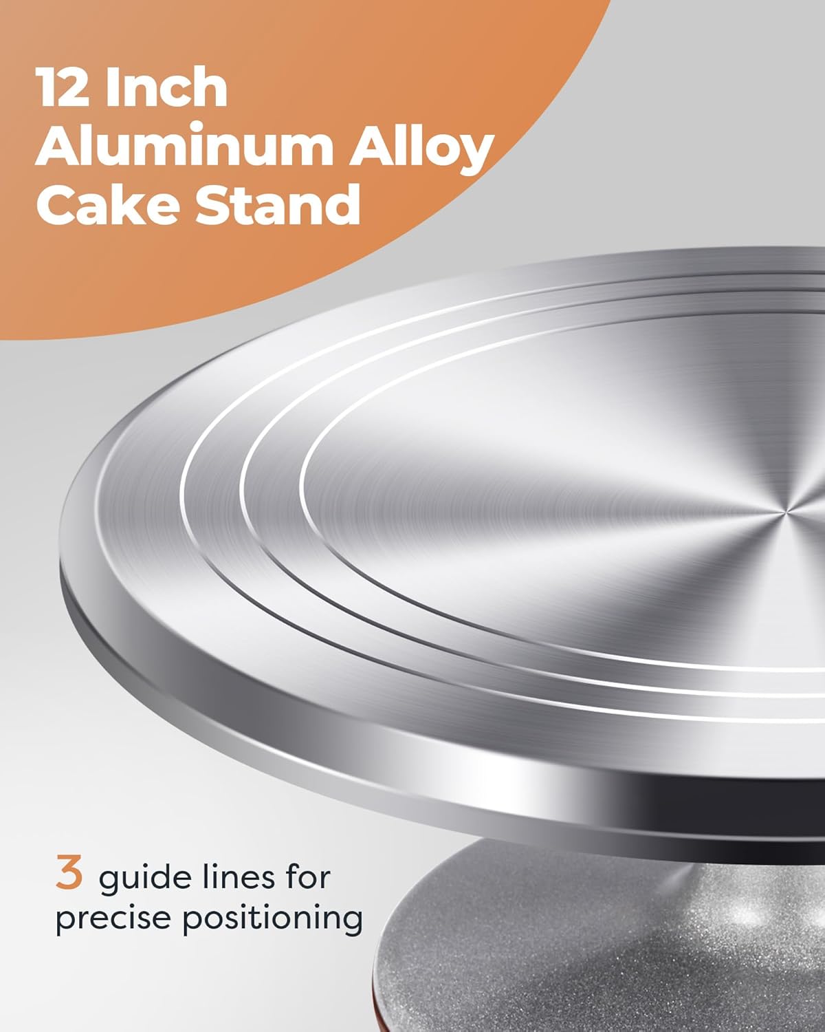 - Aluminium Alloy Cake turntable: Constructed with heavy duty aluminium alloy, non-slip surface & rubber feet provides an excellent stability on countertop, keep the cake stand from moving and can help you get to all sides of the cake.