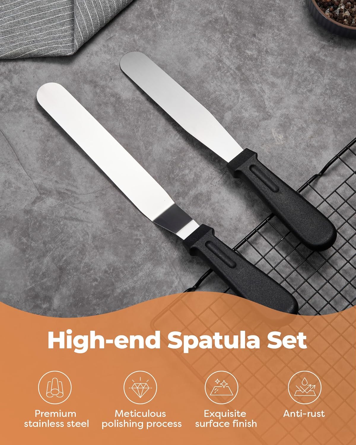 - All in One 183 Pcs Cake Decorating Kits: 1 Aluminium alloy cake turntable, 12 large numbered tips, 30 numbered stainless steel icing tips, 3 decorating combs, 1 icing smoother, 2 silicone pastry bags, 2 flower nails, 3 couplers, 4 icing bag ties, 9 fondant tools, 6 cookies cutter, 1 decorating pen, 4 icing spatula, 1 cake leveler, 100pcs disposable pastry bags and 1 cleaning brush.