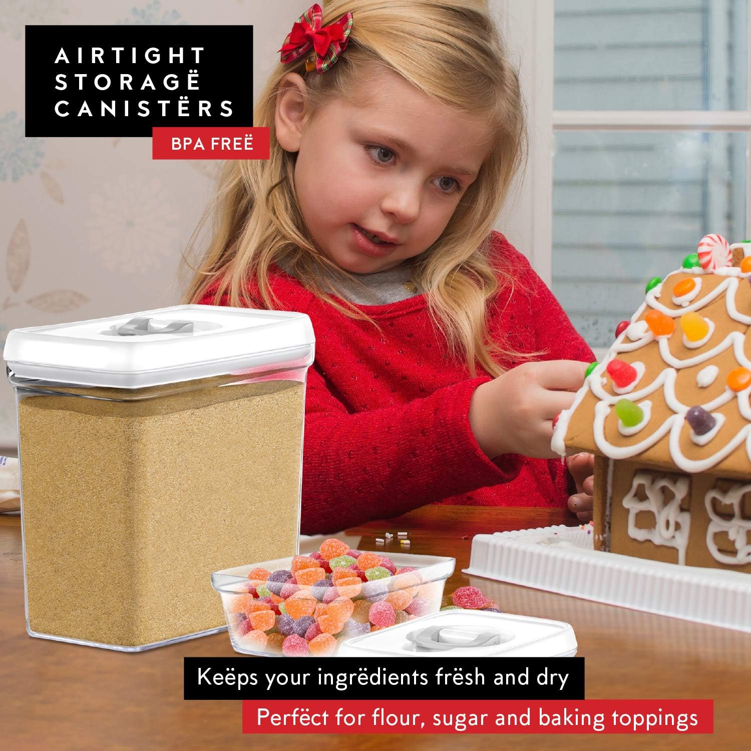 - 4 Space-Saving Storage Containers: Our kitchen flour storage containers set come in two different sizes. 2 large containers (16 cups /3.8 liters) the ideal size for a 5 lb bag of flour and sugar. 2 small containers (3.25 cups /.77 liters) that are perfect to store other baking supplies or decorating ingredients!