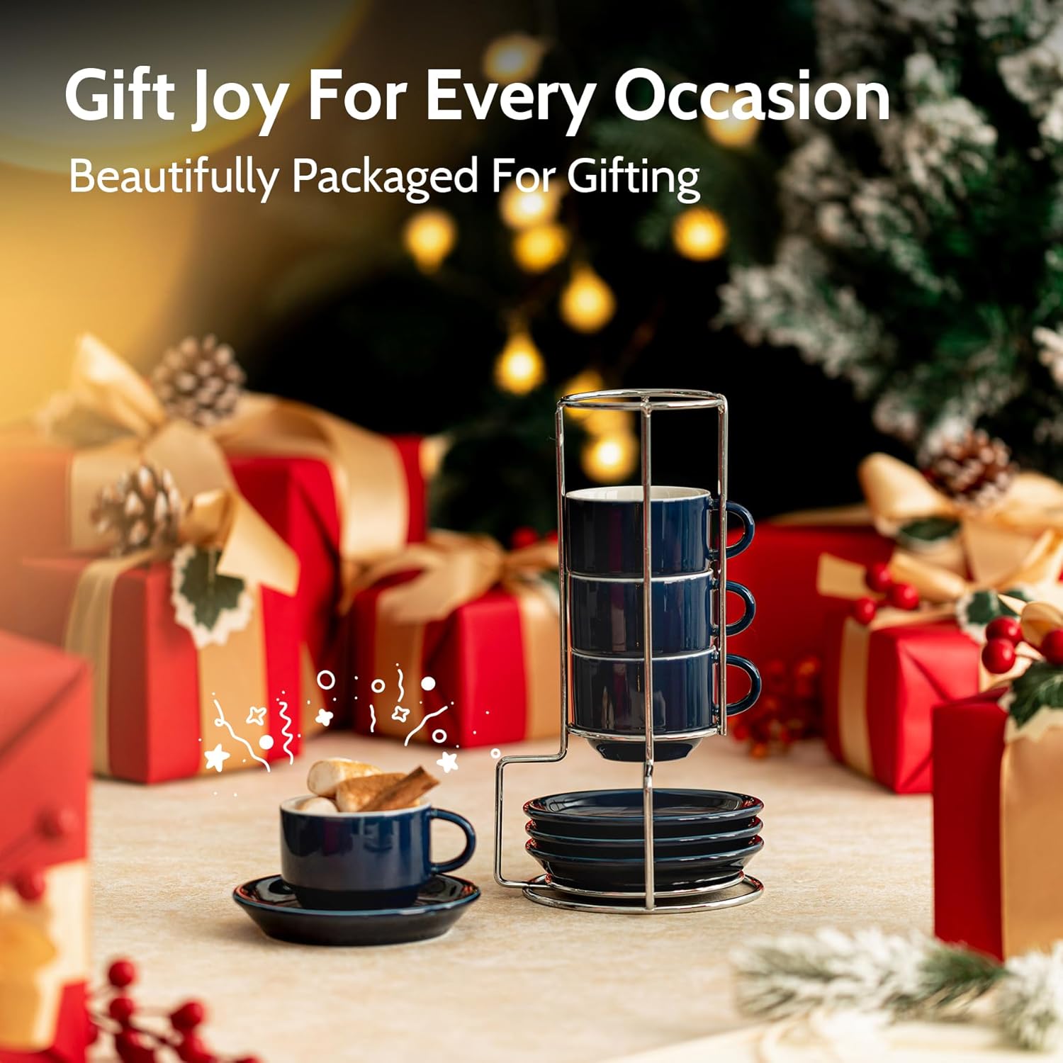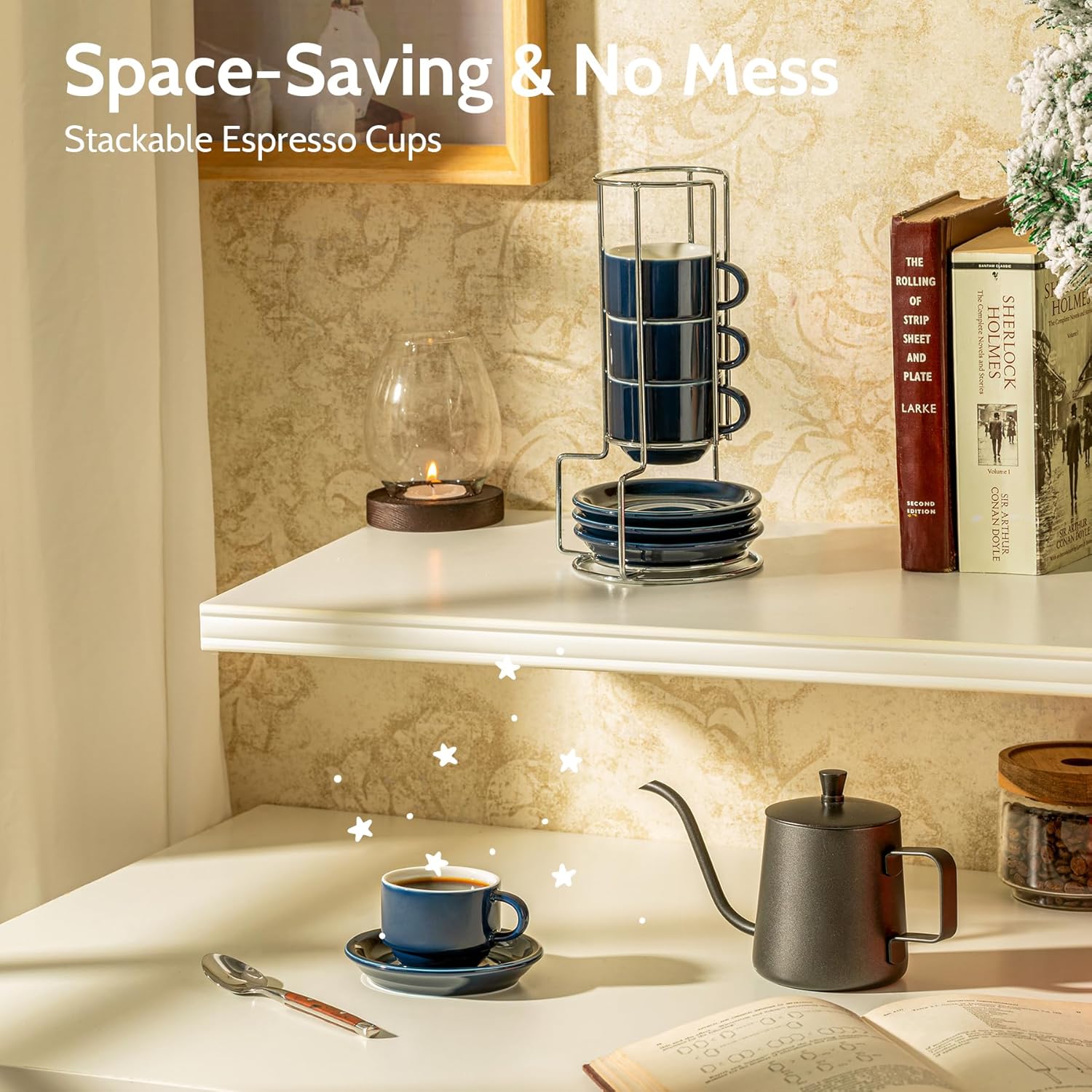 Sweese 2.5 Ounce Porcelain Stackable Espresso Cups with Saucers and Metal Stand Set of 4, Navy