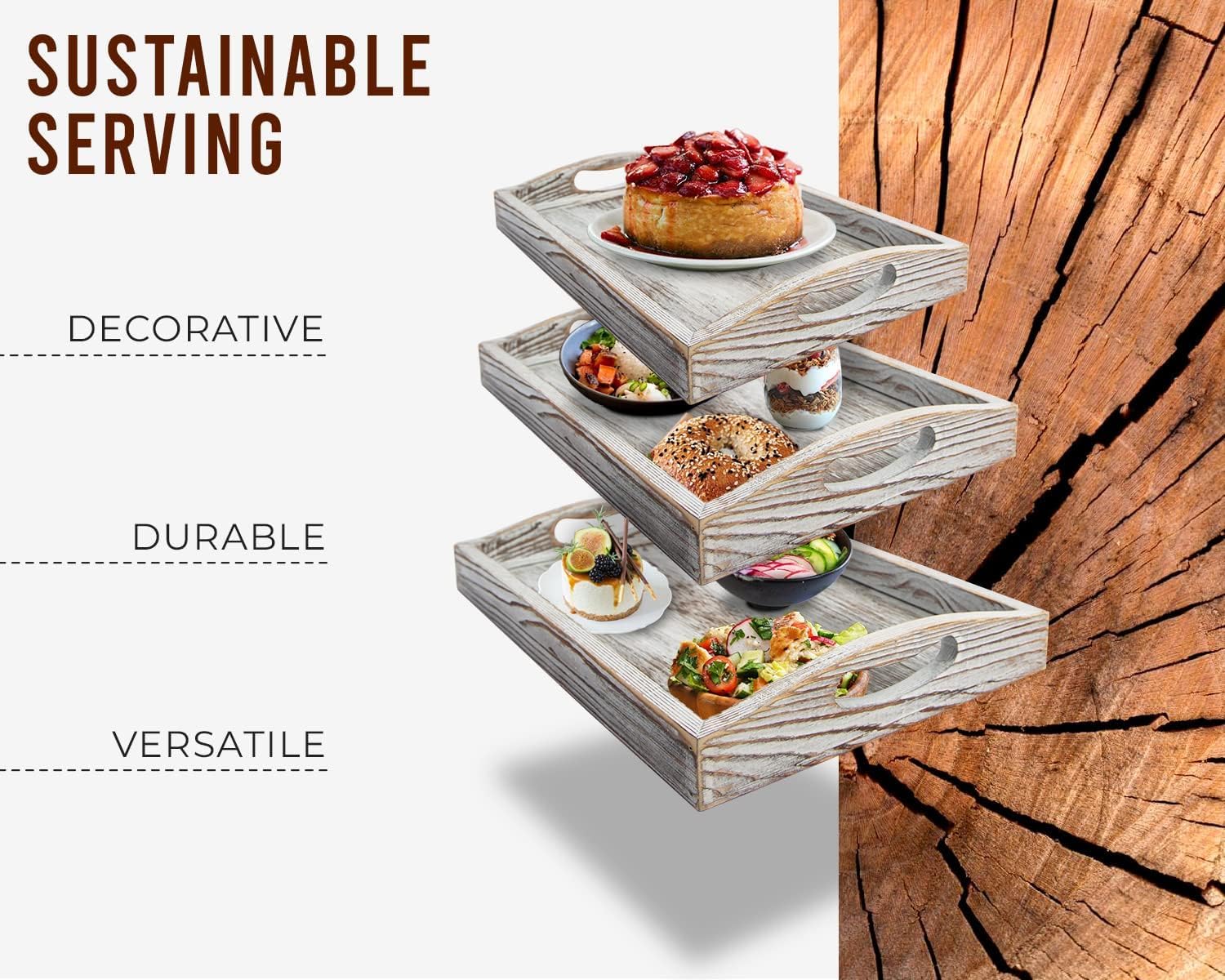Serving Trays Set of 3 - Ottoman Wood Trays for Entertainment, Food and Décor - Rustic Farmhouse Distressed Wood Finish - Rustic White