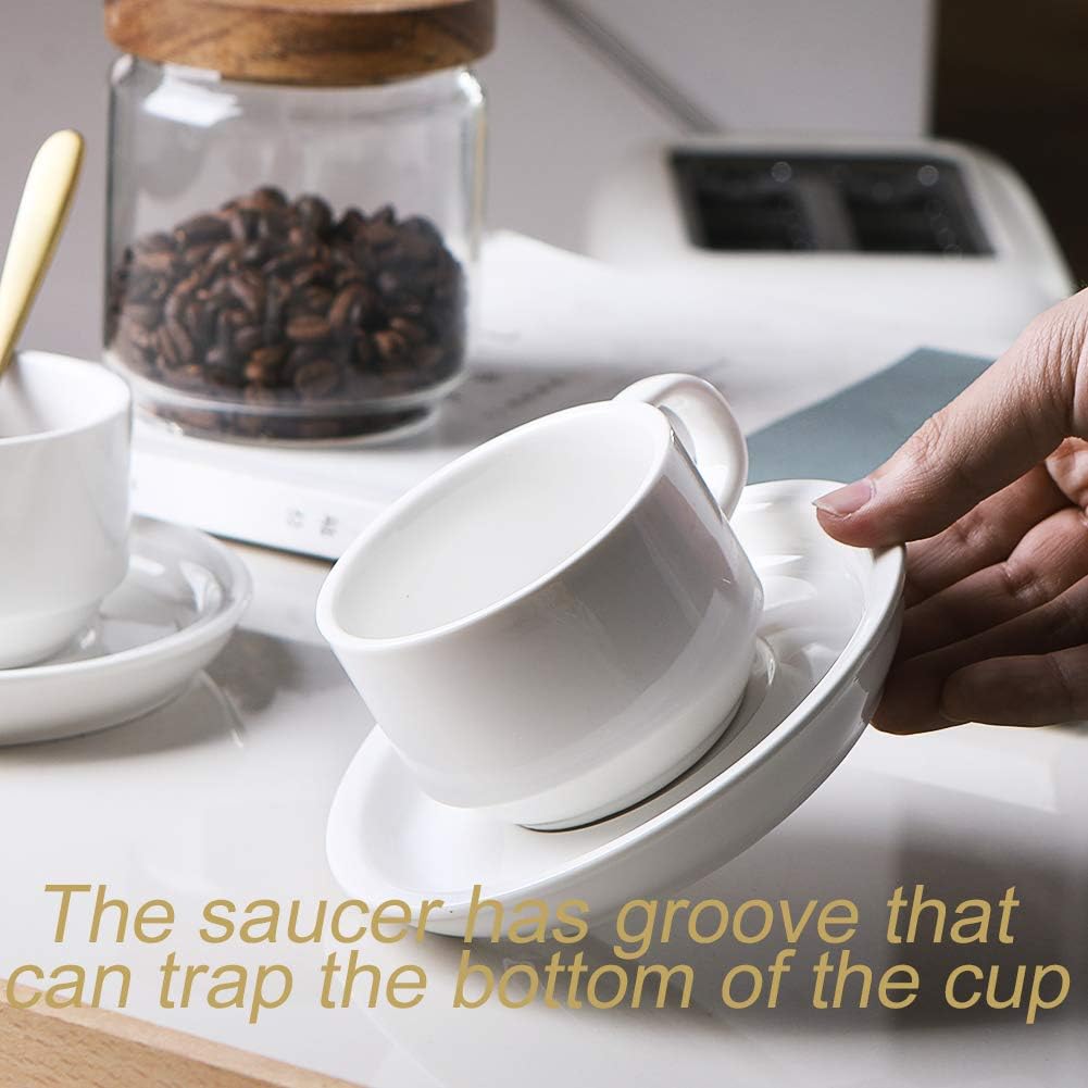 - Save Space - The cups and saucers can be stacked on top of each other in metal brackets for easy management. Save space and keep your kitchen clean. The saucer has groove that can trap the bottom of the cup. The cup doesn't slide when you carry it around.