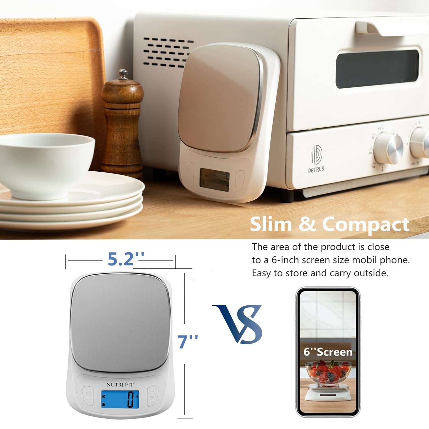 NUTRI FIT Food Kitchen Scale Digital Grams and Ounces Ultra Slim Scale Portable for Baking Cooking Camping Stainless Tare Auto Off Backlit Large LCD Display 11lb/5kg-White