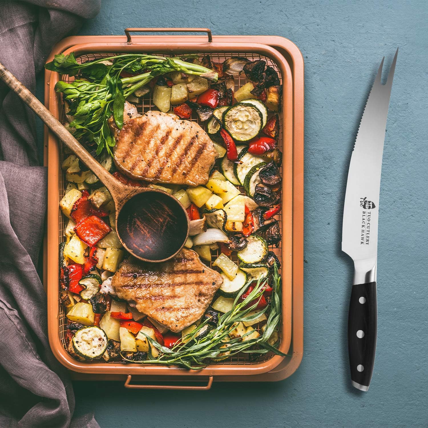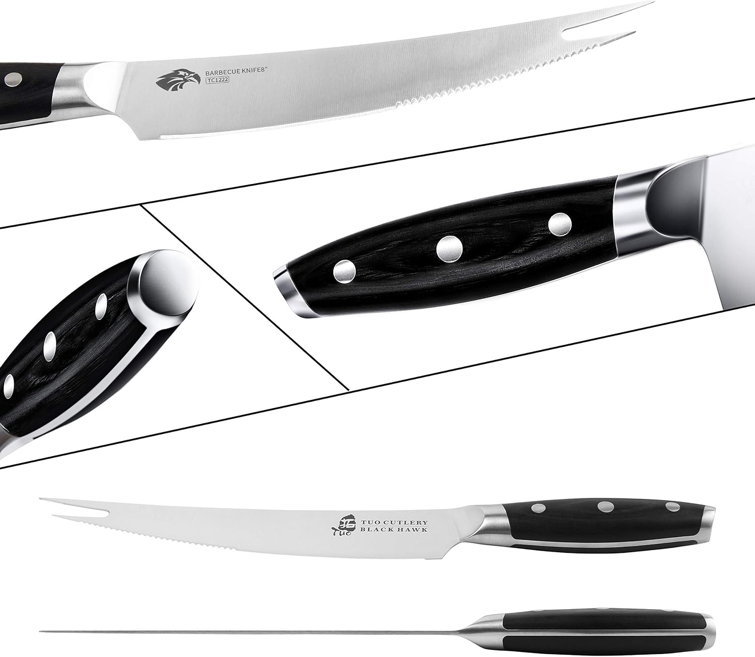 TUO Carving Knives & Forks - Barbecue knives 8'' - Meat Cutting Fork-Shaped Tip Utility bbq Knives - German X50CrMoV15 Steel Knife - Full Tang Pakkawood Handle with Gift Box - BLACK HAWK Series