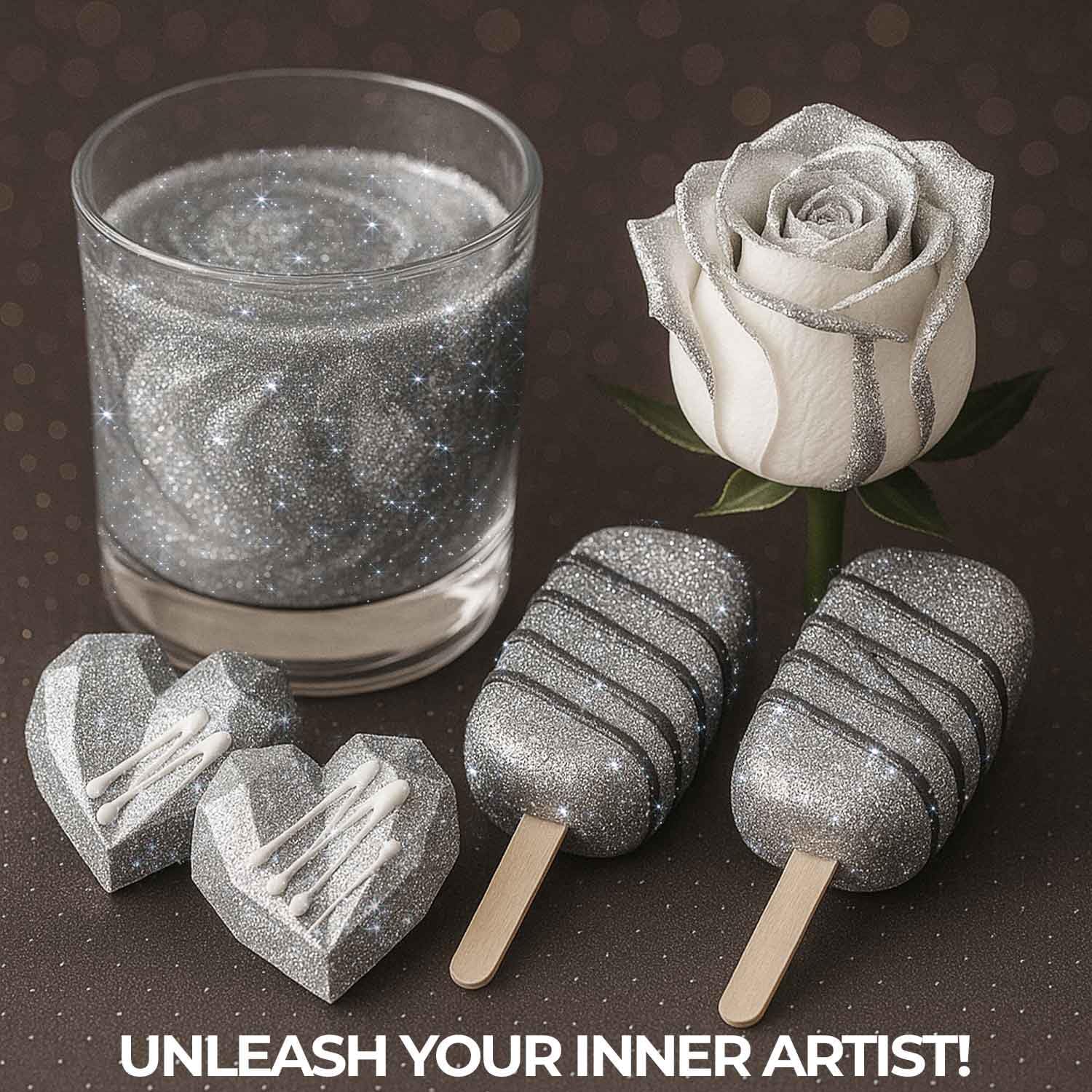 - 𝗘𝗗𝗜𝗕𝗟𝗘 𝗚𝗟𝗜𝗧𝗧𝗘𝗥 𝗙𝗢𝗥 𝗗𝗥𝗜𝗡𝗞𝗦 Glam up your desserts with edible glitter for cakes or bring sparkle to drinks using our edible glitter for cocktails. Our silver glitter is made from premium, food-safe ingredients including tasteless edible and silver. This silver edible glitter is the perfect finishing touch for baking, drinks, and all your cake decorating needs—guaranteed to wow at any event.