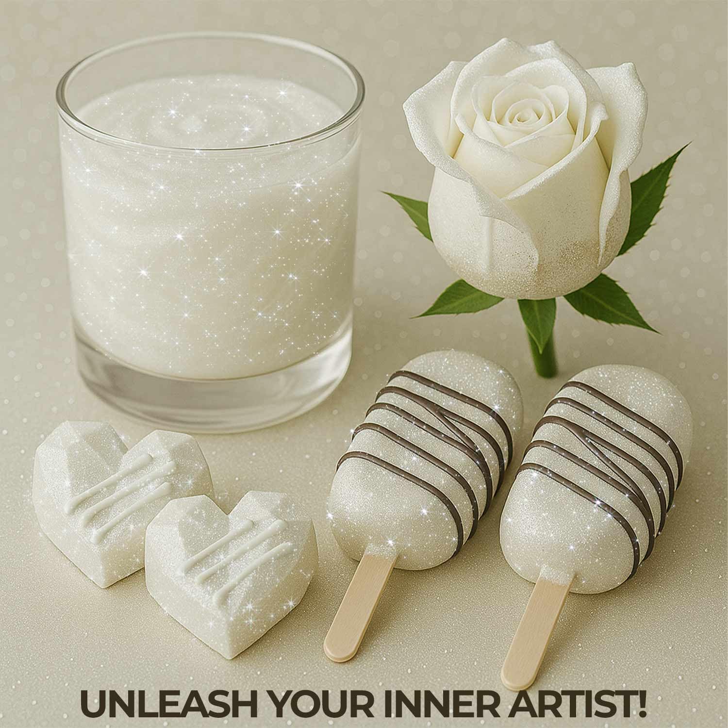 - 𝗘𝗗𝗜𝗕𝗟𝗘 𝗚𝗟𝗜𝗧𝗧𝗘𝗥 𝗙𝗢𝗥 𝗗𝗥𝗜𝗡𝗞𝗦 Glam up your desserts with edible glitter for cakes or bring sparkle to drinks using our edible glitter for cocktails. Our white glitter is made from premium, food-safe ingredients including tasteless edible and white. This white edible glitter is the perfect finishing touch for baking, drinks, and all your cake decorating needs—guaranteed to wow at any event.