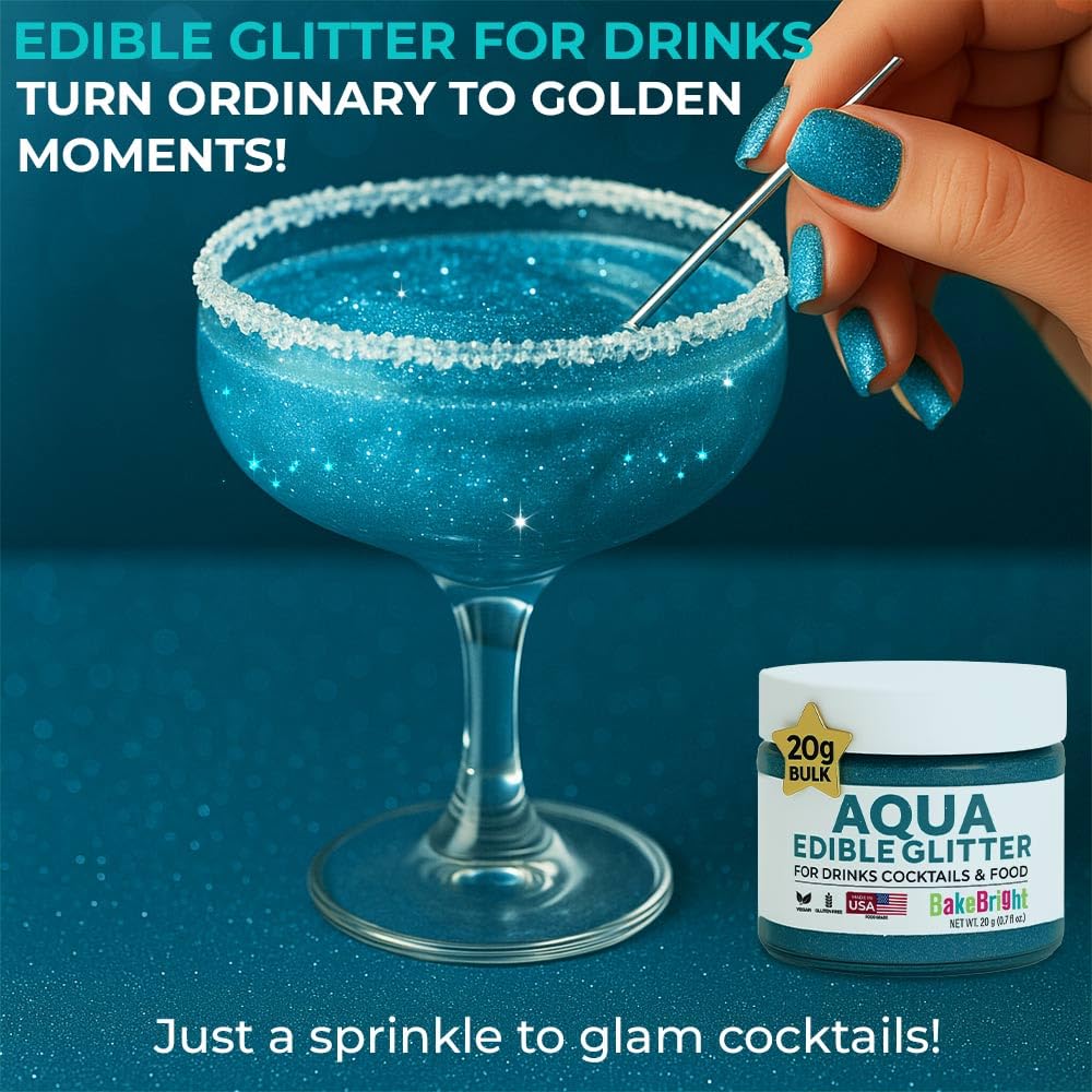 - 𝗘𝗗𝗜𝗕𝗟𝗘 𝗚𝗟𝗜𝗧𝗧𝗘𝗥 𝗙𝗢𝗥 𝗗𝗥𝗜𝗡𝗞𝗦 Glam up your desserts with edible glitter for cakes or bring sparkle to drinks using our edible glitter for cocktails. Our light blue glitter is made from premium, food-safe ingredients including tasteless edible and light blue. This blue edible glitter is the perfect finishing touch for baking, drinks, and all your cake decorating needs—guaranteed to wow at any event.