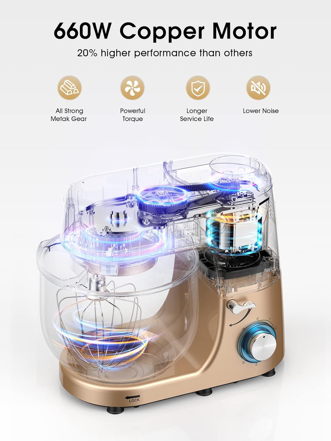 - Special Feature : Adjustable speed control, Tilt head Mixers, Smart chip controlled, Fully automatic electric stand mixer, 660W powerful high performance pure copper motor, 8.5Qt stainless steel bowl with 2 handle, 6+p speeds rotary knob with pulse function, Full metal gears + ball bearing + belt structure, LED light as power indicator, Low noise, 360° planetary mixing, Strong suction cups for more steady, Over-Heating and overload protection, Dishwasher safe, ETL certificate Adjustable speed control, Tilt head Mixers, Smart chip controlled, Fully automatic electric stand mixer, 660W powerful high p… See more