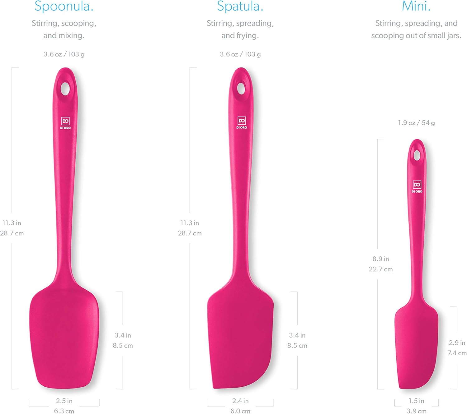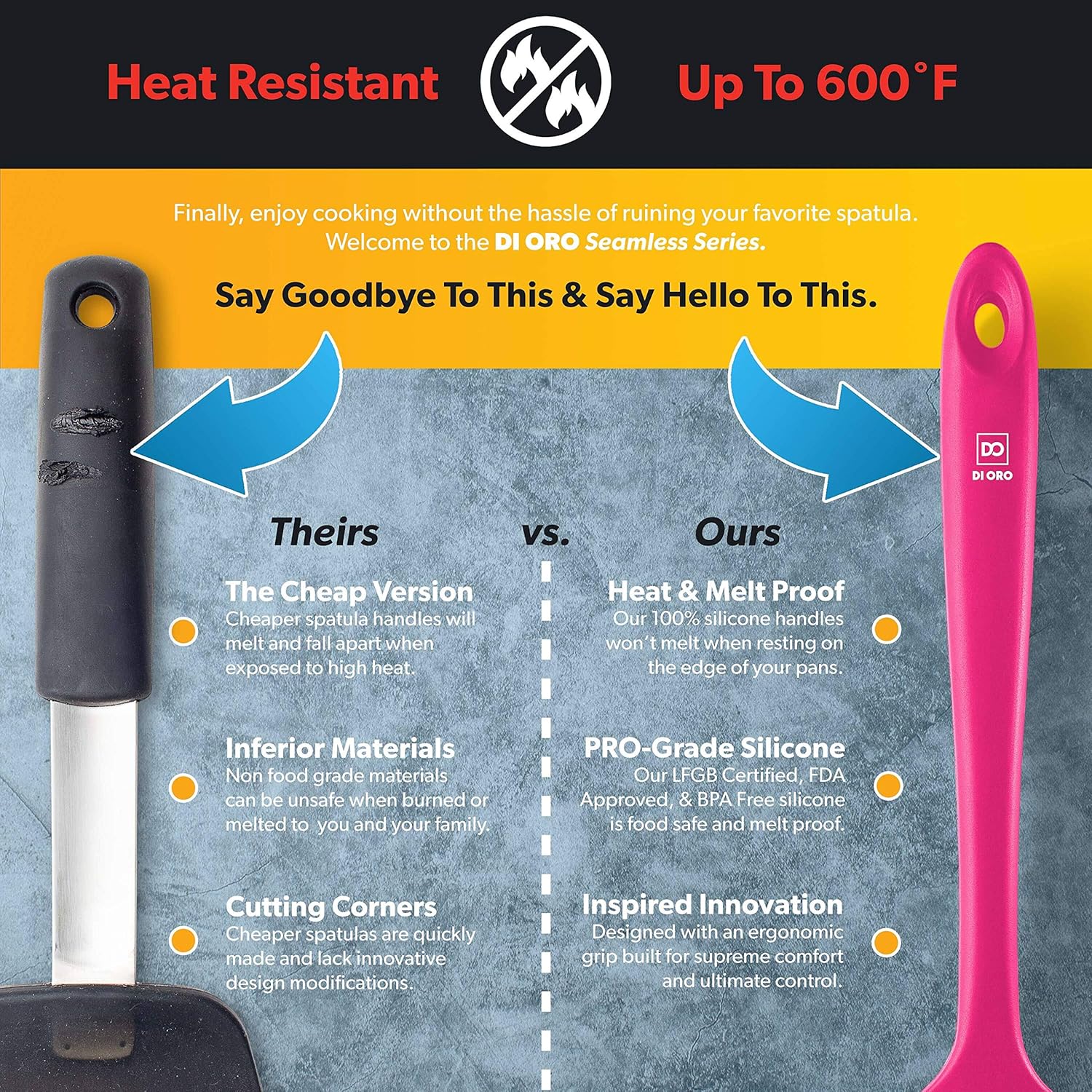 - ONLY THE BEST – The DI ORO Seamless Series Spoonula is made with food grade, BPA Free, and LFGB Certified Silicone. Built to withstand the heat, our versatile and dependable spoonula is heat-resistant up to 600°F, which means you will never melt your favorite kitchen utensil.