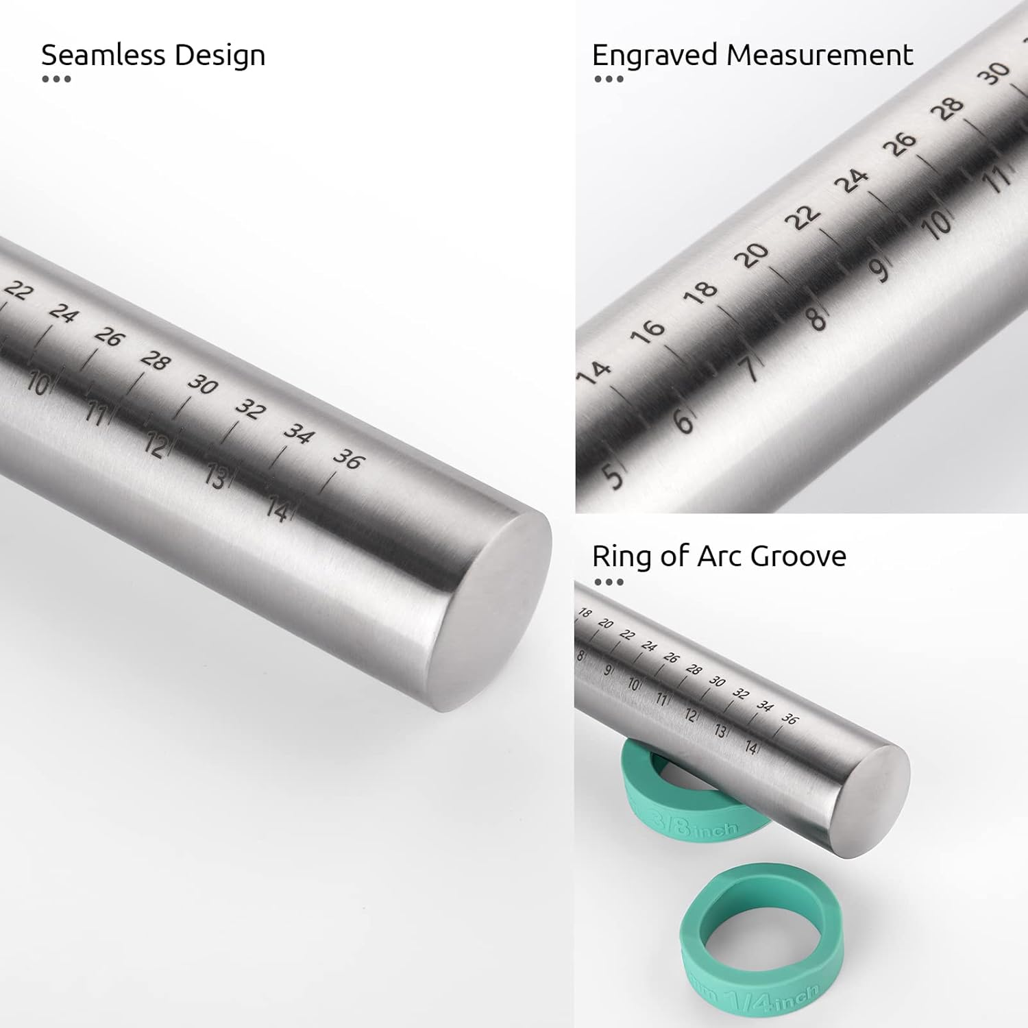 - [4 Rings with Arc Groove] With arc groove in the thickness ring, they can be used as a stand for the roller to avoid falling off the counter. We notice that the sound of metal on stone may annoy you and U-Taste don't want that to happen on our steel rolling pin, so we found the rings with arc groove design. Simple place the roller on after using. No loud noise and no falling off issues.