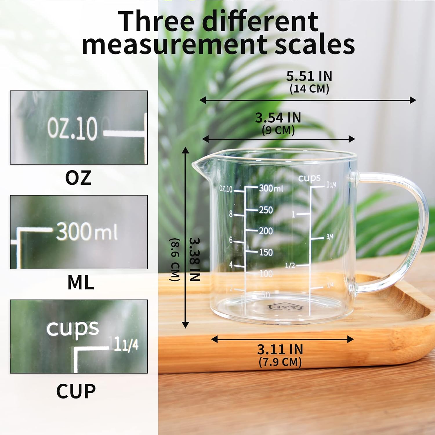 - Made from high borosilicate glass, lightweight, 3 different measurement scales, including Cup, ML/CC, OZ, easy to read.
