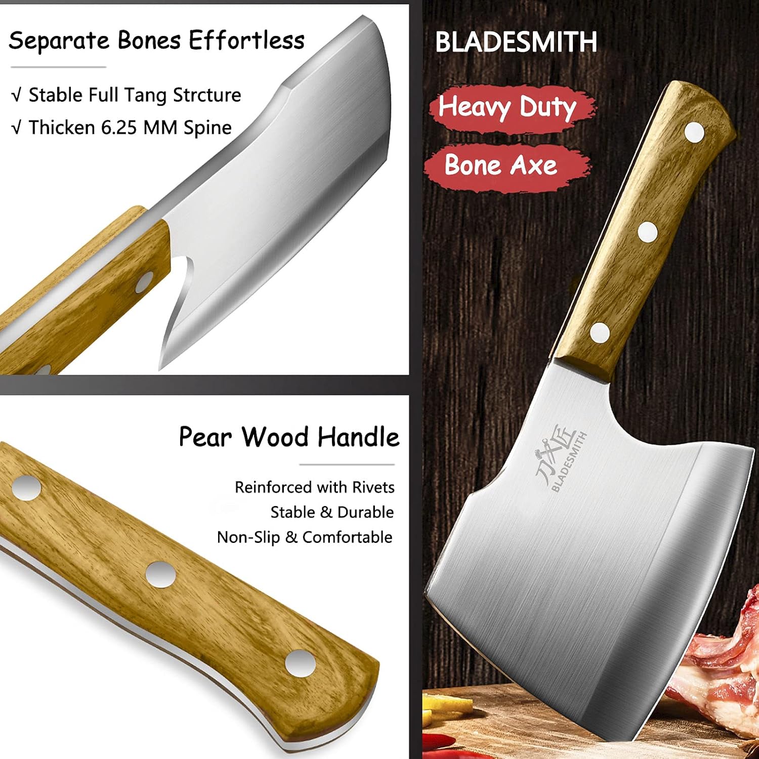 BLADESMITH Meat Cleaver Butcher Axe Bone Chopper Heavy Duty - 6.3'' Bone Cutting Knife Bone Breaker, Stainless Steel Thicken Blade & Pear Wood Handle, Slaughterhouse Looks Manly,2025 Gifts