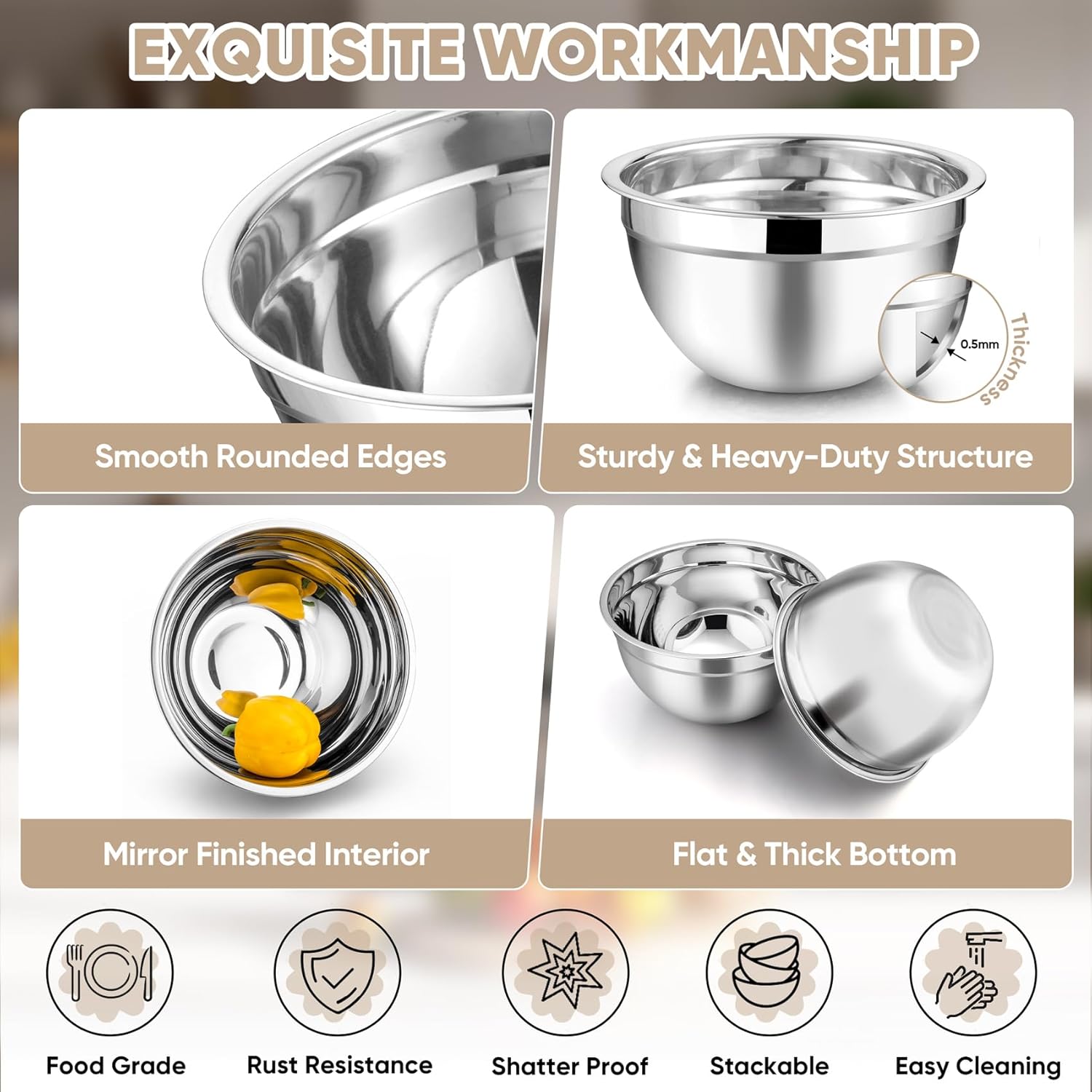 - Multi-Function: The nesting bowls include 5 different size 4.5 / 3 / 1.5 / 1 / 0.7 QT, Sufficient for multiple usages on your home kitchen, bakery and restaurant, Such as Mixing Salad, Whipping Cream, Preparing Food, Serving Fruits or Storing Leftover, A wonderful gift for your families and friends