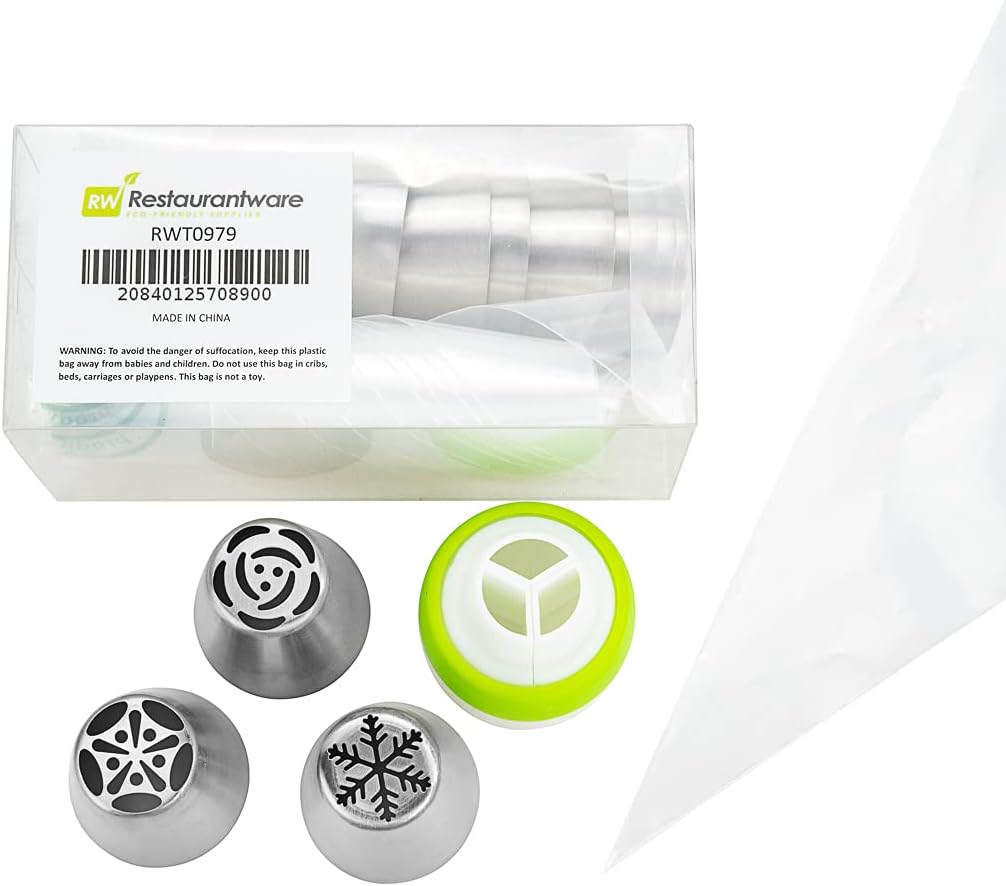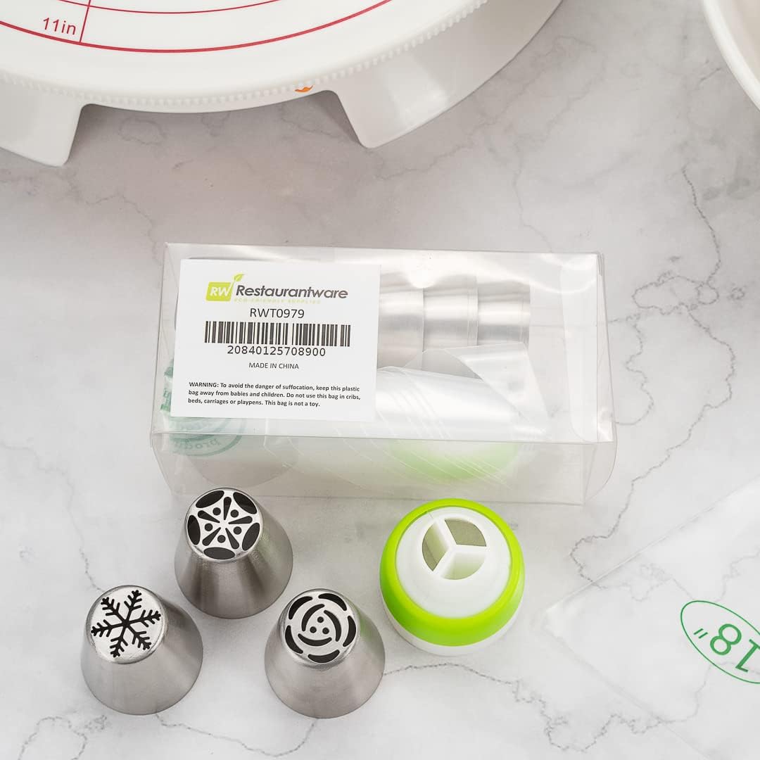 Restaurantware Pastry Tek Russian Piping Tips Set 21 Piece Durable Cake Decorating Kit - 10 Piping Tips 10 Piping Bags Stainless Steel Piping Bags And Tips Set 1 Tri-Color Coupler