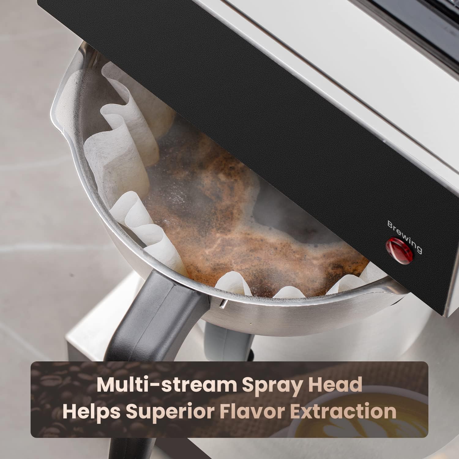 - MULTI-STREAM SPRAY HEAD - Showers hot water evenly over the coffee grounds, Large flat bottom filter and funnel allows greater interaction between hot water and coffee grounds for superior flavor extraction. Replace the coffee powder with tea leaves, It can also be used as a tea maker, It is a perfect commercial coffee brewer for home office.