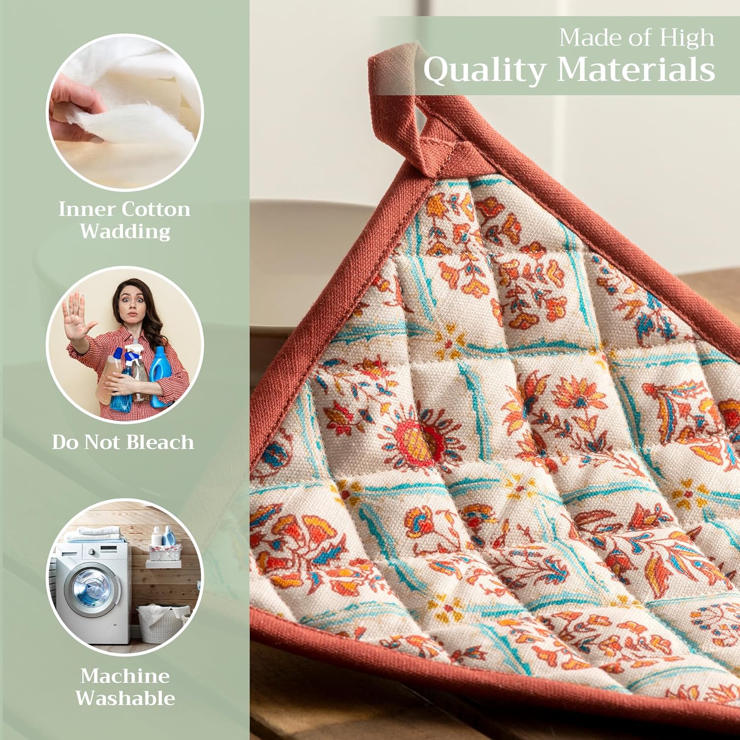 - 100% Quilted cotton: Made from premium quilted cotton, our pot holder ensures safe handling of hot pans or dishes. The soft, durable build provides excellent heat resistance and grip—perfect for everyday cooking and baking needs