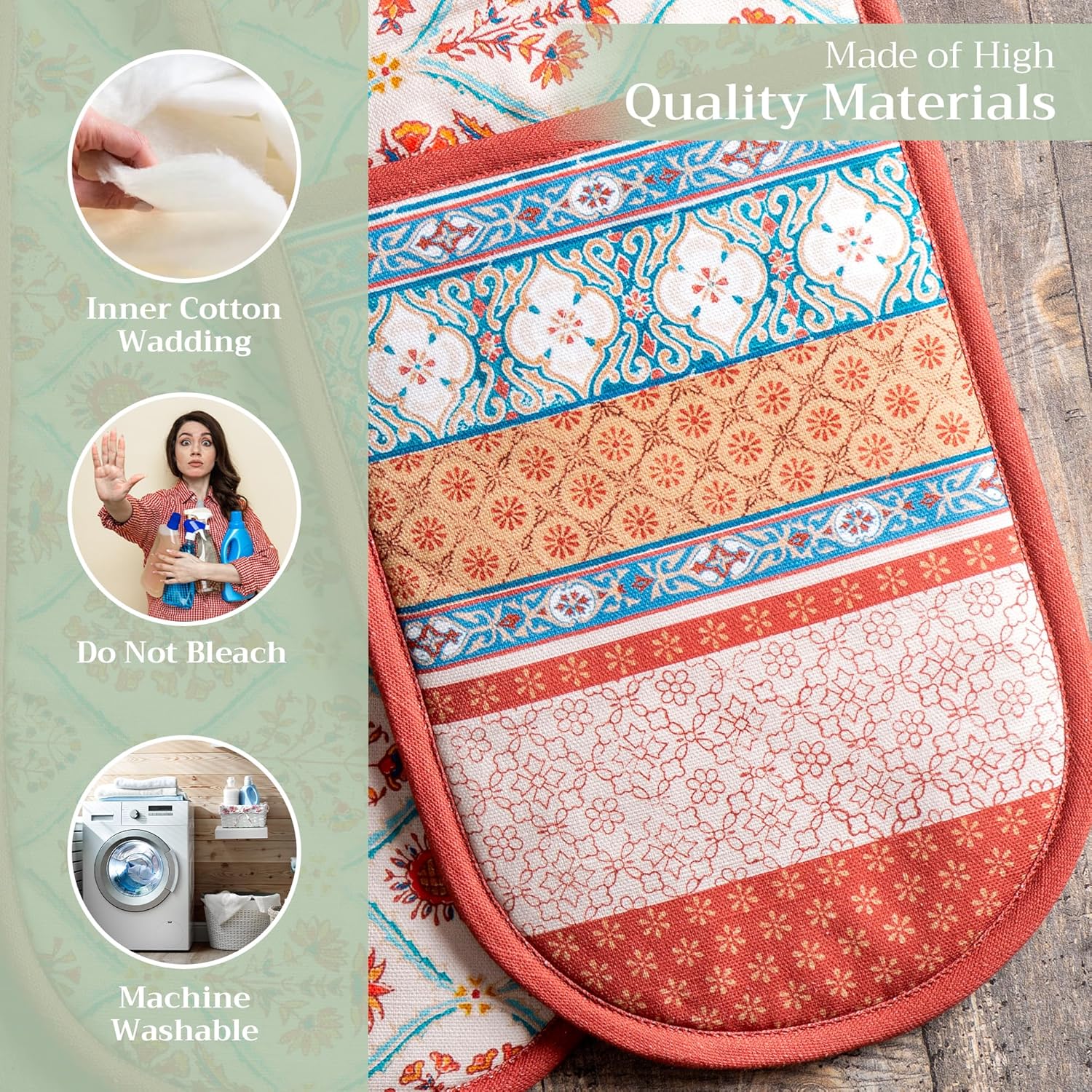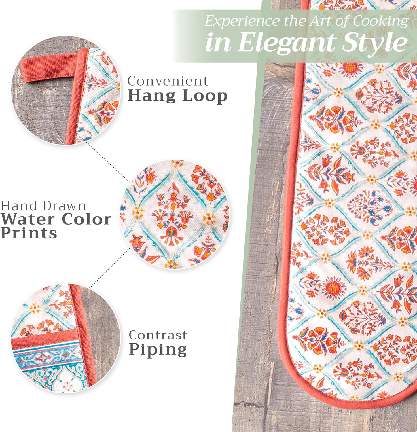 - Package includes: Includes 1 double oven mitt sized 7"x35". Perfect for handling hot cookware safely while adding a touch of European elegance to your kitchen. Designed in Europe and made in India with care