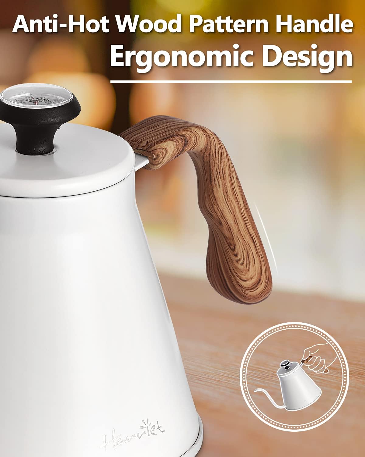 - Heat resistant handle ensures safety during pouring: Ergonomic resin handle with wood texture prevents slipping and burns; Lift and pour comfortably with bare hands for steady control; Included heat-insulating base protects the tabletop from burns