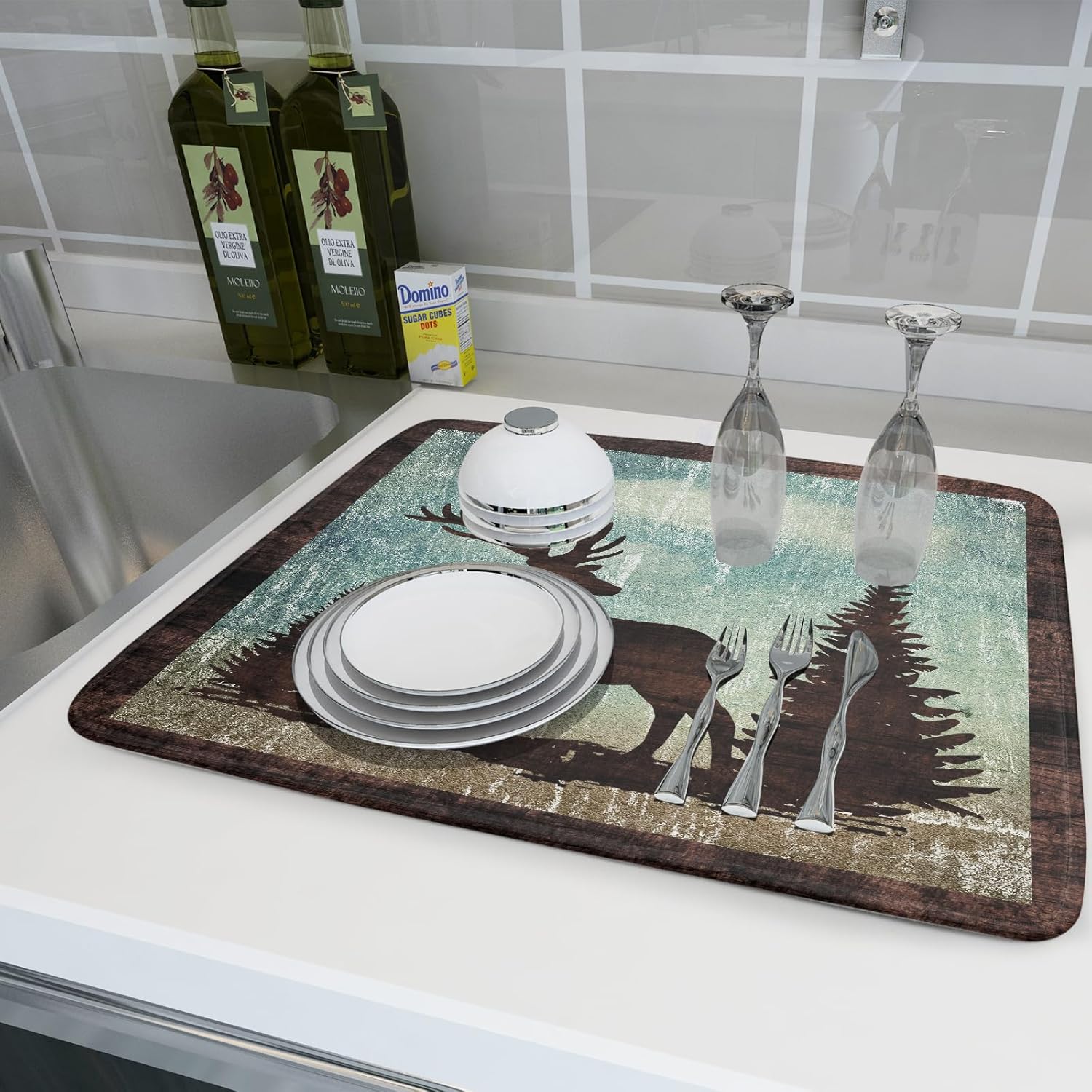 - ❀ 【HIGHLY ABSORBENT, QUICK DRYING】 With the middle made of composite sponge, microfiber terry cloth on the reversible side absorbs 4X its weight in water, which easily keeps your counter dry. Use alone or pair with a dish drainer. Our ultra absorbent Elk Moose Silhouette Dishes Pad will suck up all the left wetness from your pots, pans, and dishes, and leave the underside both dry. Our slip-resistant backing adds stability when drying stemware or other delicate items.