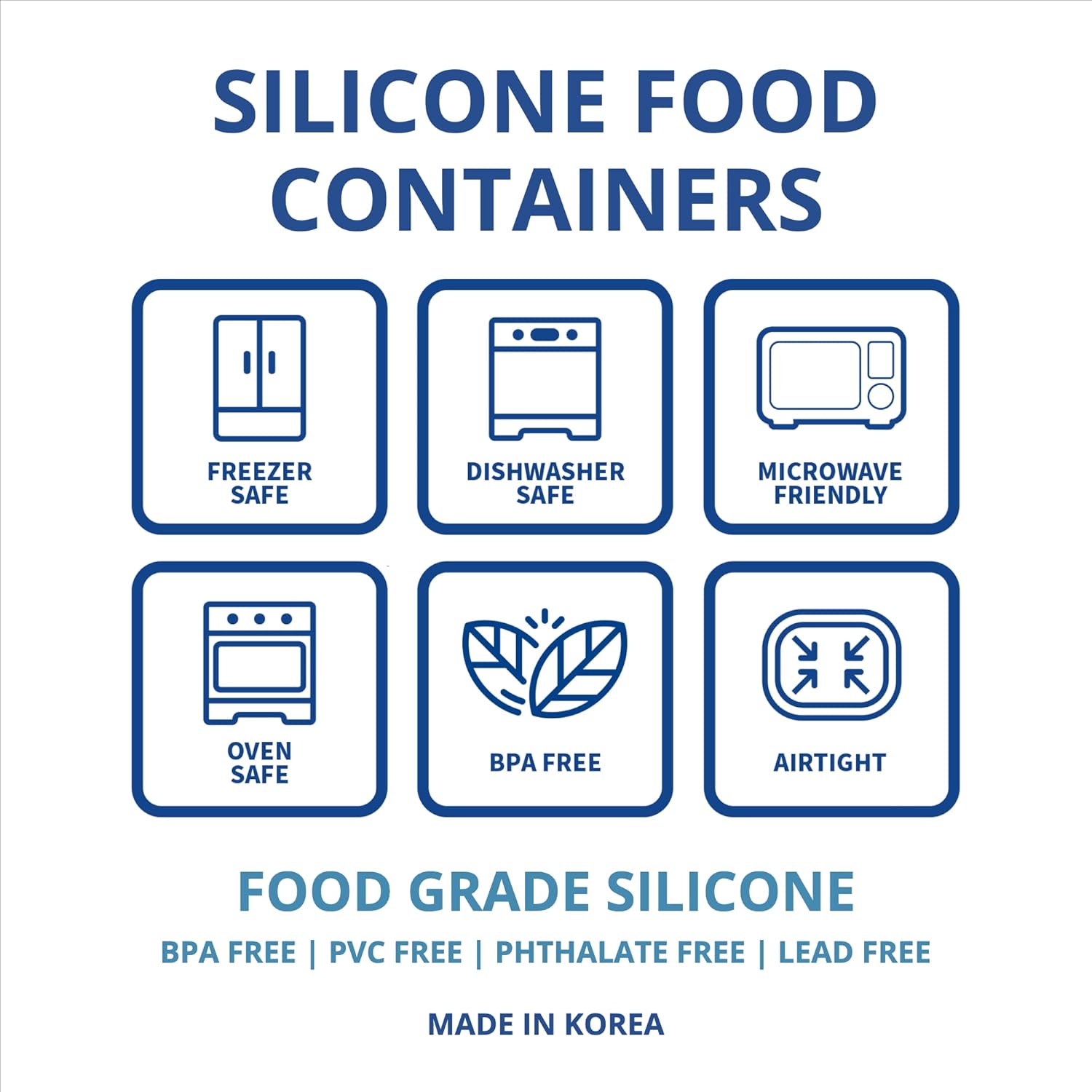 - Food Grade Silicone - For ease of use and mind, our silicone containers for food storage are made in South Korea using premium food-grade silicone that is free of BPA, PVC, Latex and Phthalates