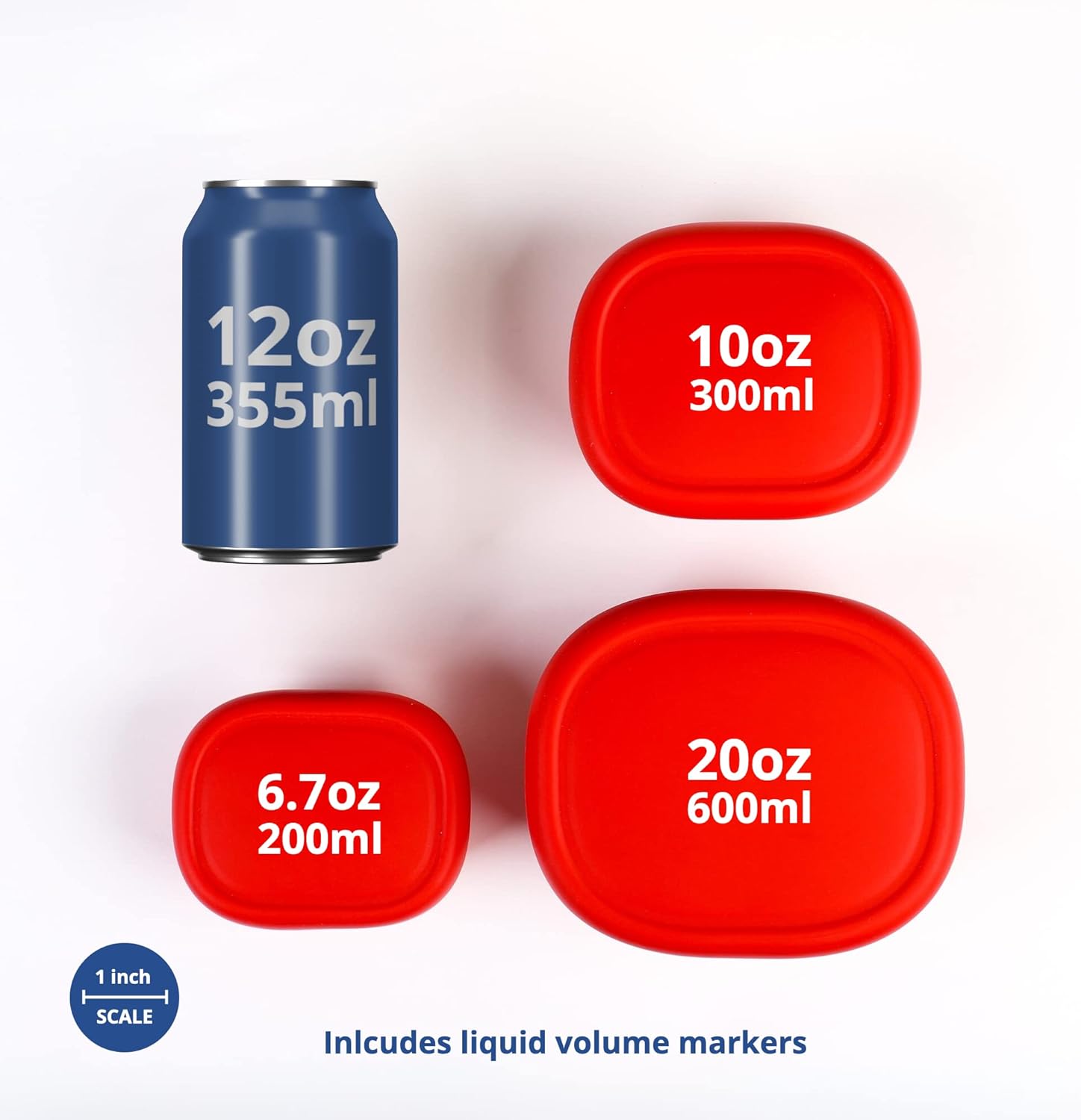 - Size - Each 3-pack set includes a 2.9" x 1.7" x 2.00" (6.7oz); 3.6" x 4.4" x 2" (10oz); 4.5" x 5.3" x 2.5" (20oz) silicone container with matching solid easy-to-clean silicone lids.