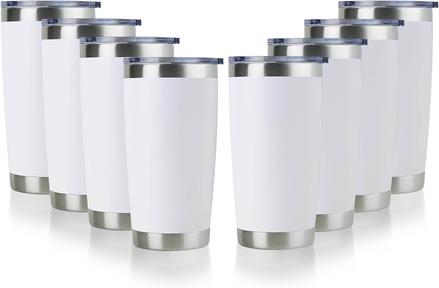 DOMICARE 20oz Stainless Steel Tumbler Bulk with Lid, Double Wall Vacuum Insulated Travel Mug, Powder Coated Coffee Cup, Powder White, 8 Pack