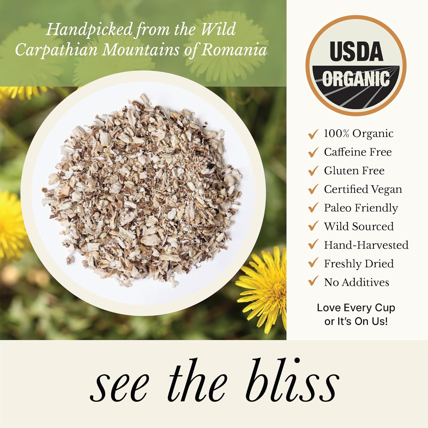 - WILD SOURCED; SINGLE ORIGIN; wild-crafted in small batches from the bio-diverse mountains of Romania; we dry and package our dandelion roots at source to preserve their freshness and botanical quality