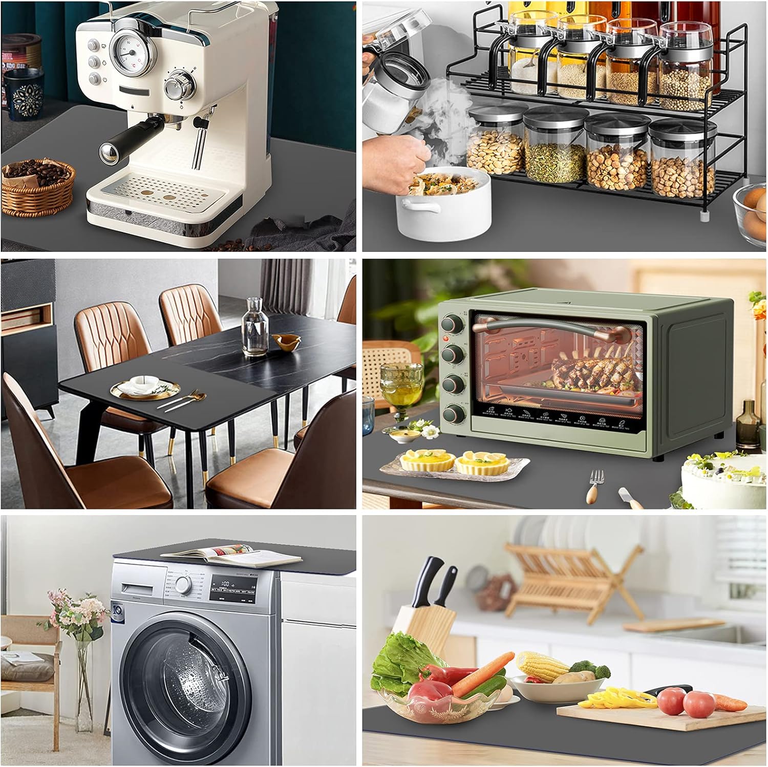 - You Can’t Go Wrong with It: This placemat can solve multiple problems. Great for catching messes. Protect counters from spills, scratches, grease, coffee stains, or damage. Place hot items of all sizes directly on the mat without having to dig through the drawer for a hot pad and no more need for trivets. Reduce the noises made by appliances. No need to worry about items slipping off the countertop. Tools will keep in place. Even if you are rolling dough hard on it, the mat won't slide