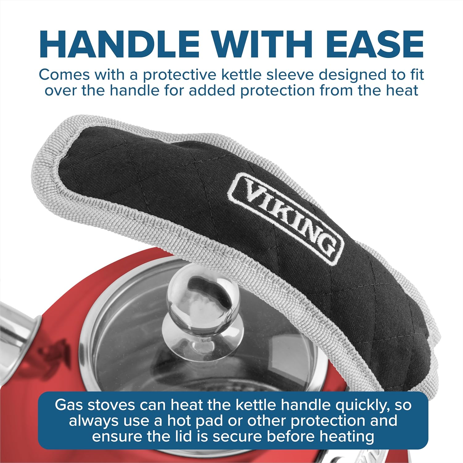 Viking 3-Ply Stainless Steel Tea Kettle, 2.6 Quart Stovetop Hot Water Pot with Tempered Glass Lid, Ergonomic Handle, Induction Ready, Red