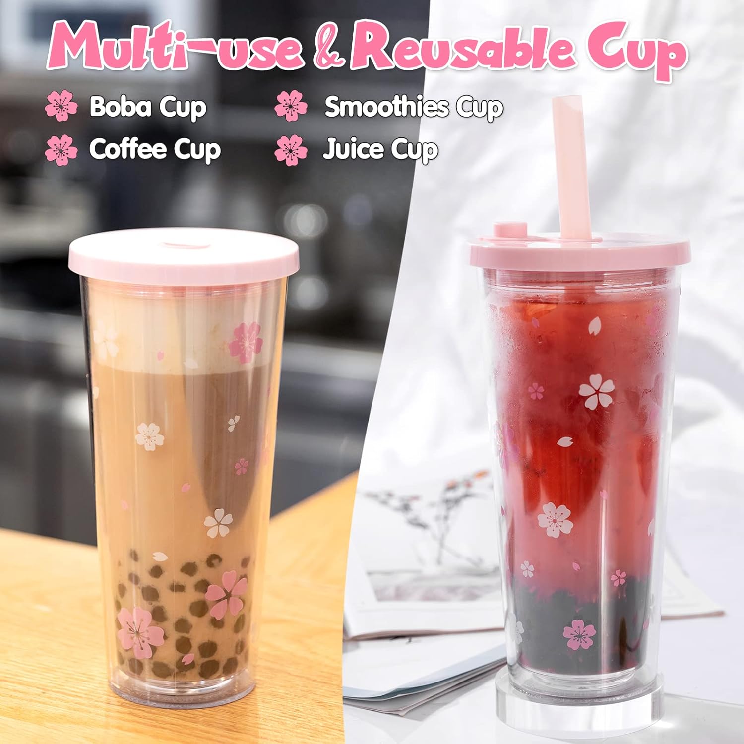 - 【Unique and Reusable PP material】Our kawaii cherry boba cups with pink straws and lids are unique in design, cute and practical. Reusable PP-plastic boba cup with straw is fit to replace other disposable cup, safer and more eco friendly. The double wall design can insulate some heat and cold, reducing water droplets to wet your hands.
