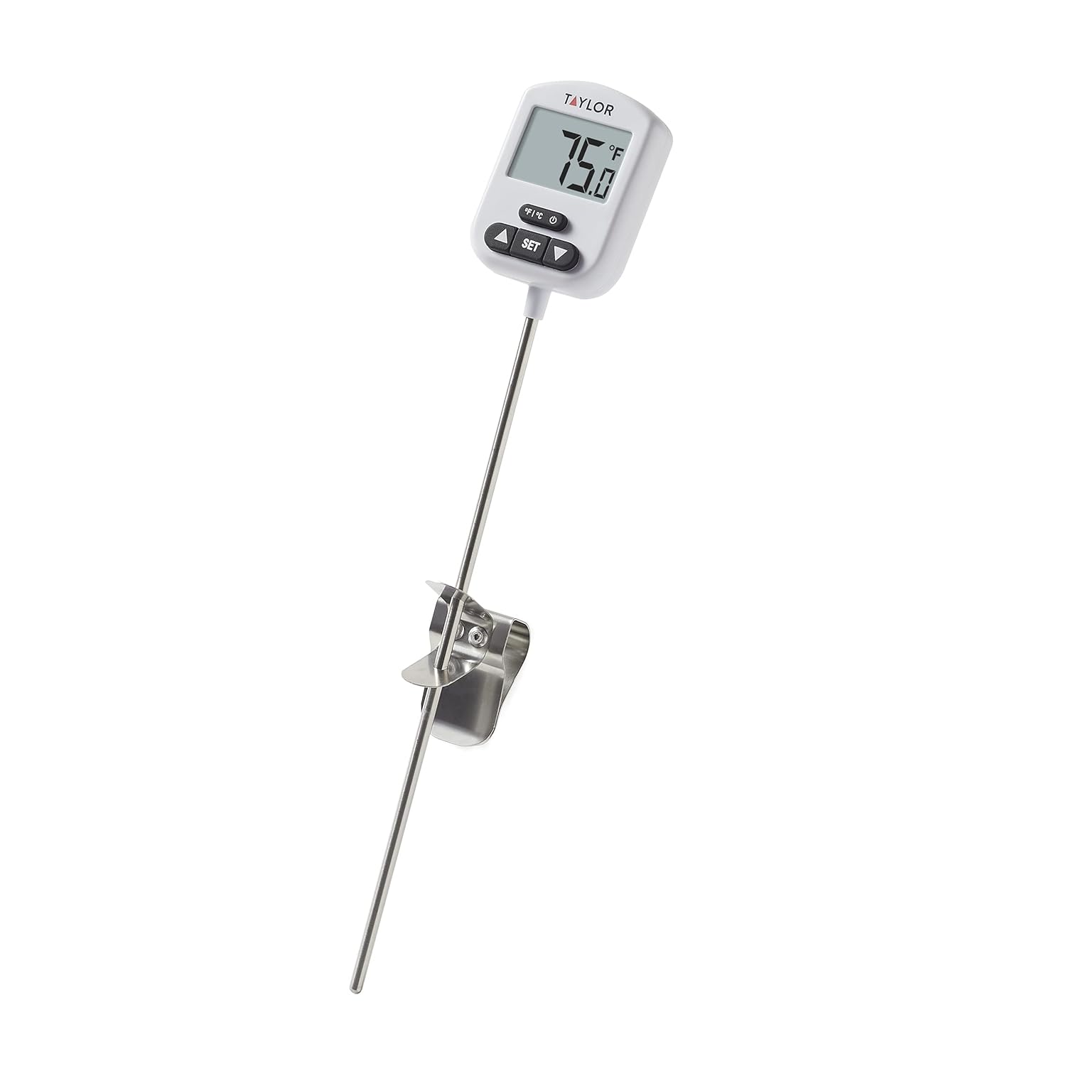 Taylor Programmable Digital Candy and Deep Fry Thermometer with Green Light Alert Display, Long Stem, and Adjustable Pan Clip, White