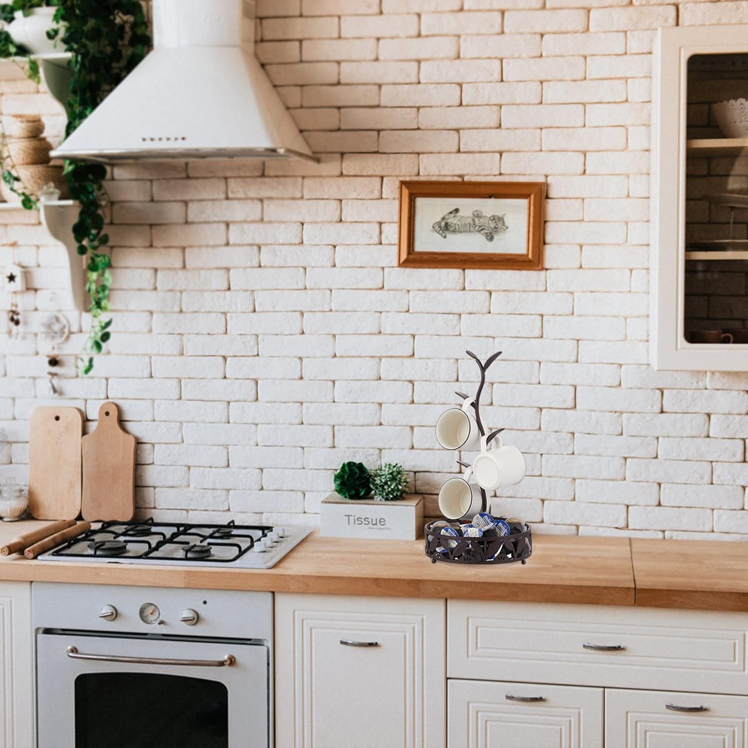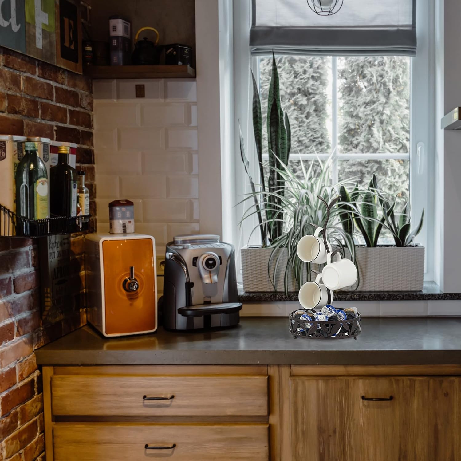 - Holds Mugs of Various Sizes & Shapes: Cups hang on the coffee cup holder by the handle, accommodating any size of ceramic or glass coffee or teacup. The leaves curve upward to keep mugs securely in place. The coffee pod holder basket at the bottom provides an extra storage space for coffee capsules, milk pods, sugar packets, mixing spoons, and even an ornament.