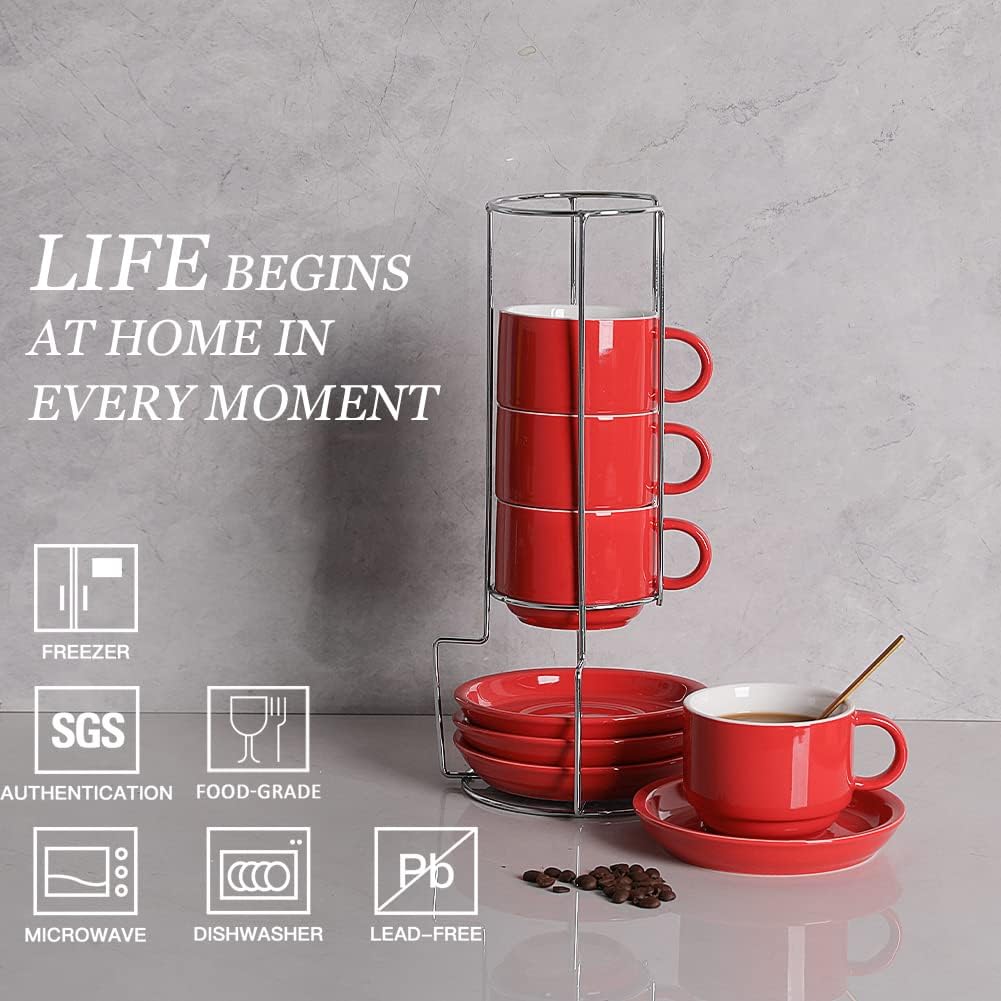 Sweejar Porcelain Cappuccino Cups with Saucers and Metal Stand, 8 Ounce Stackable Espresso Cups for Specialty Coffee Drinks, Latte, Americano, Tea - Set of 4 (Red)