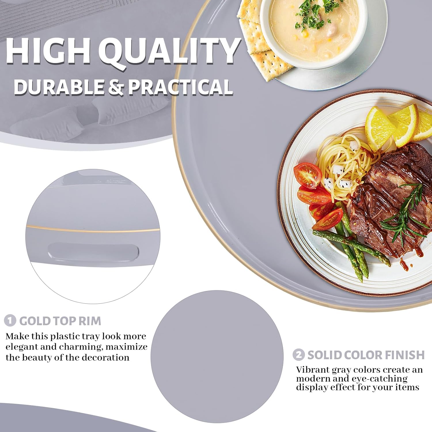 - TRAY DECOR: Gray tray is often used to present food and drinks in an appealing and organized manner. Round table tray can enhance the visual appeal of the items being served, making them more enticing to guests or customers. Also place it on your bathroom vanity as an exquisite showcase for perfumes, jewelry, or bath accessories.
