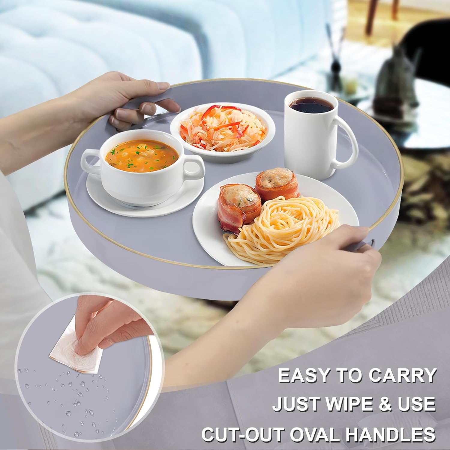 - LIGHTWEIGHT: Decorative serving tray is made of high-quality plastic, durability and lightweight. Grey round tray with built-in oval handles that are comfortable to grip and carry while avoiding any strain on your fingers. The serving tray for ottoman has surrounding 1.6" tray lips that prevent items from falling over.