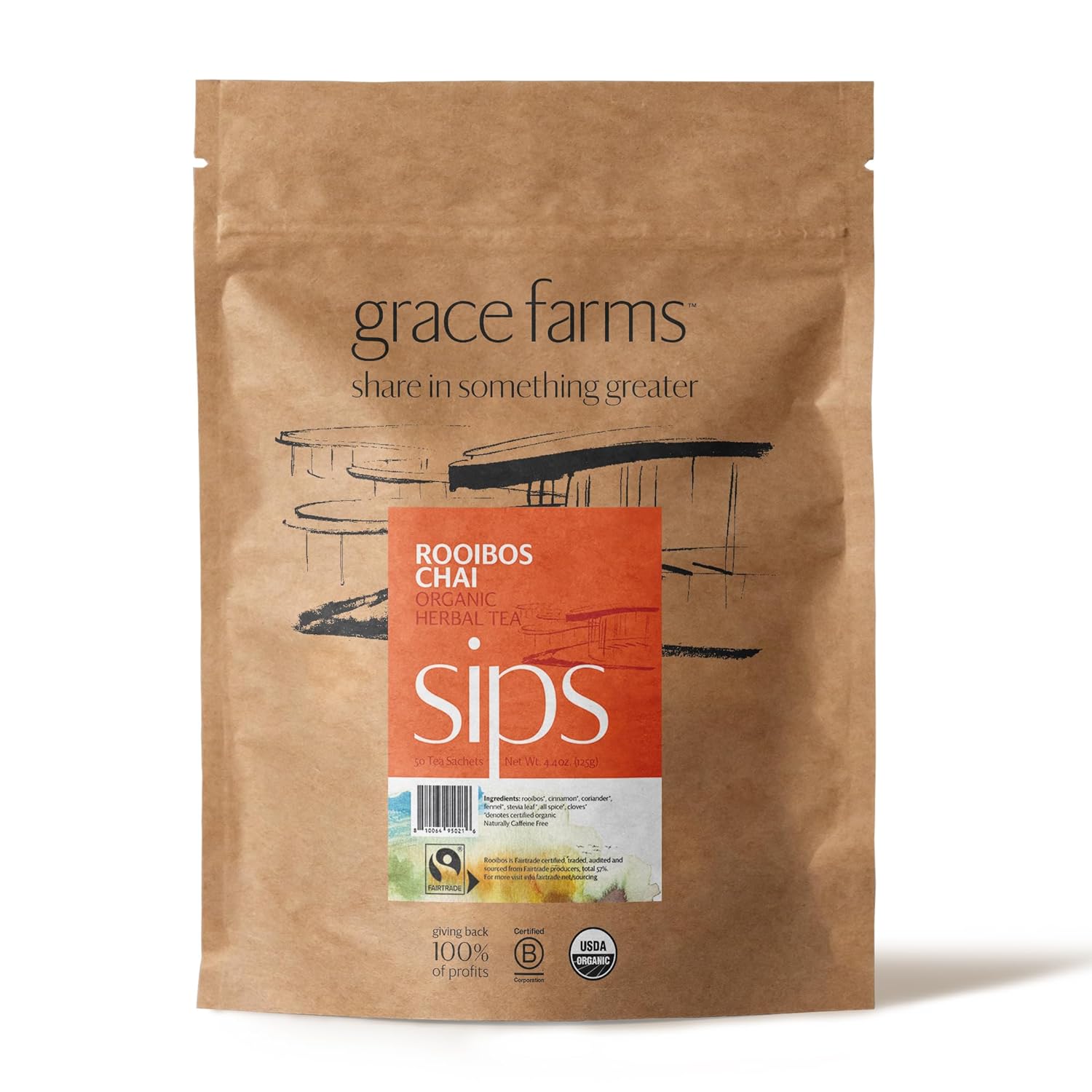 Grace Farms ROOIBOS CHAI Herbal Teas (50 count) | Naturally Sweet, Healthy and Caffeine Free | Organic, Fair Trade and Kosher Certified | Gives Back 100% of Profits