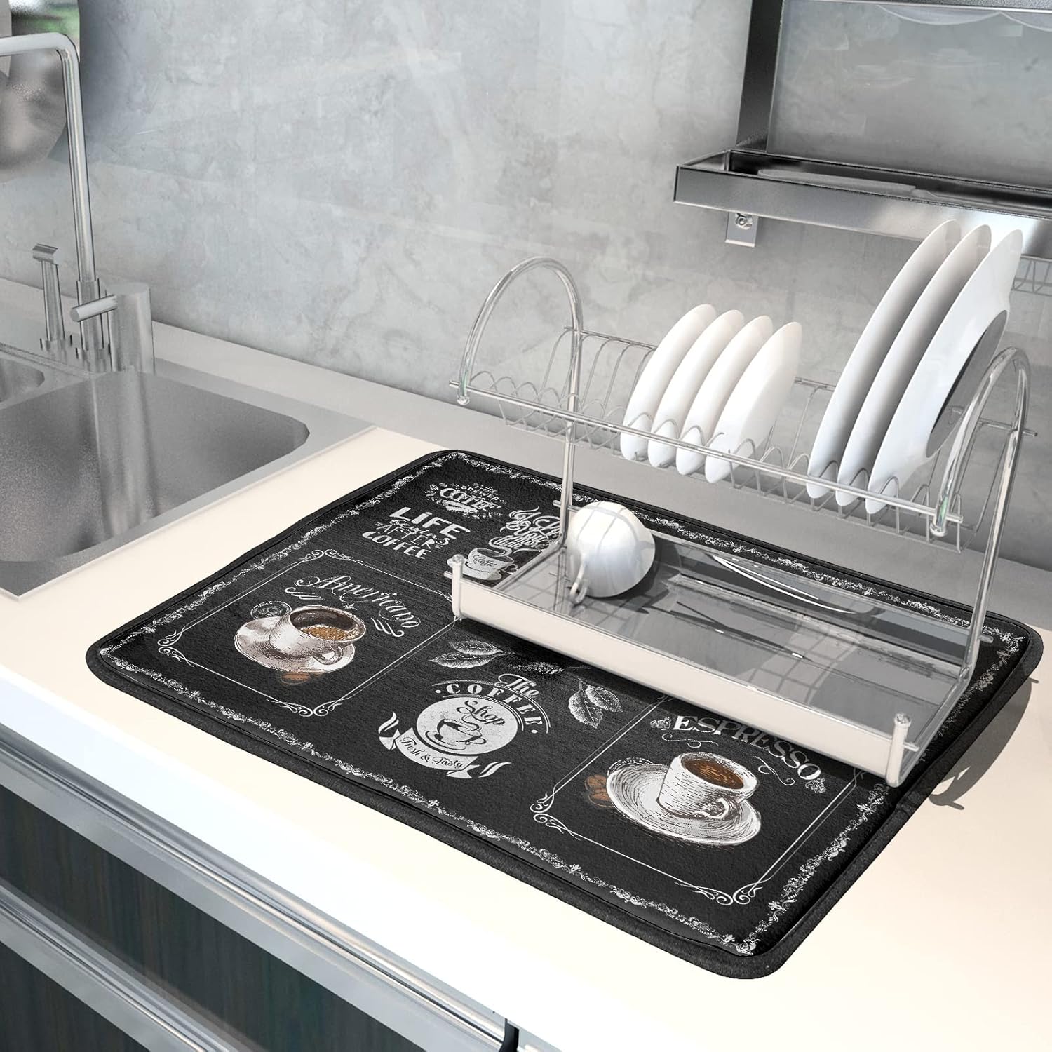 Coffee Bean Maker Dish Drying Mat for Countertops, 18x24 inch Absorbent Microfiber Espresso Cup Spill Mats Black Machine Drainer Mat Dish Drainer Rack Mat Protector Kitchen Accessories Bar Time Chef