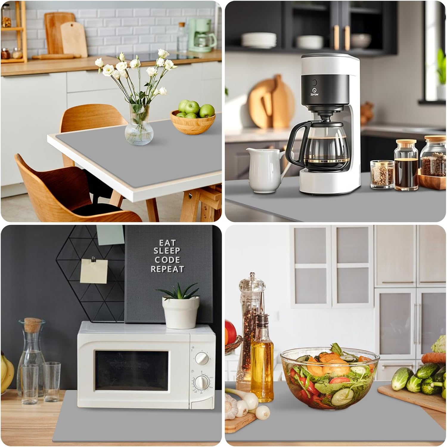 - 【ANTI-SLIP & HEAT RESISTANT】: The uniquely designed particles on the back and the overall thickness of the silicone mat holds it from moving around. This silicone counter mat will also increase the friction, ensure the cutting boards, appliances and cutlery stay in place. The heat resistance is between -40°F to 482°F, protect your ceramic tile, marble and expensive quartzite countertops from heat, scratches and stains.